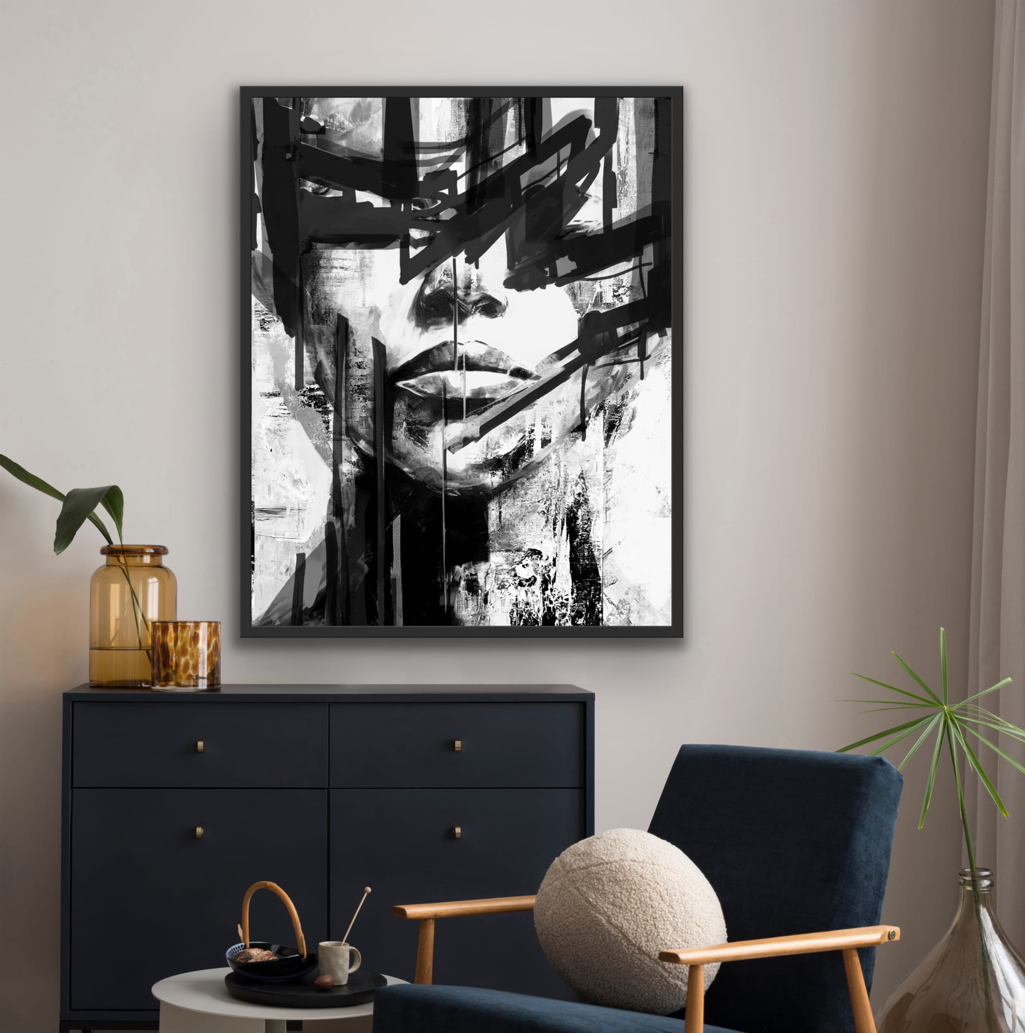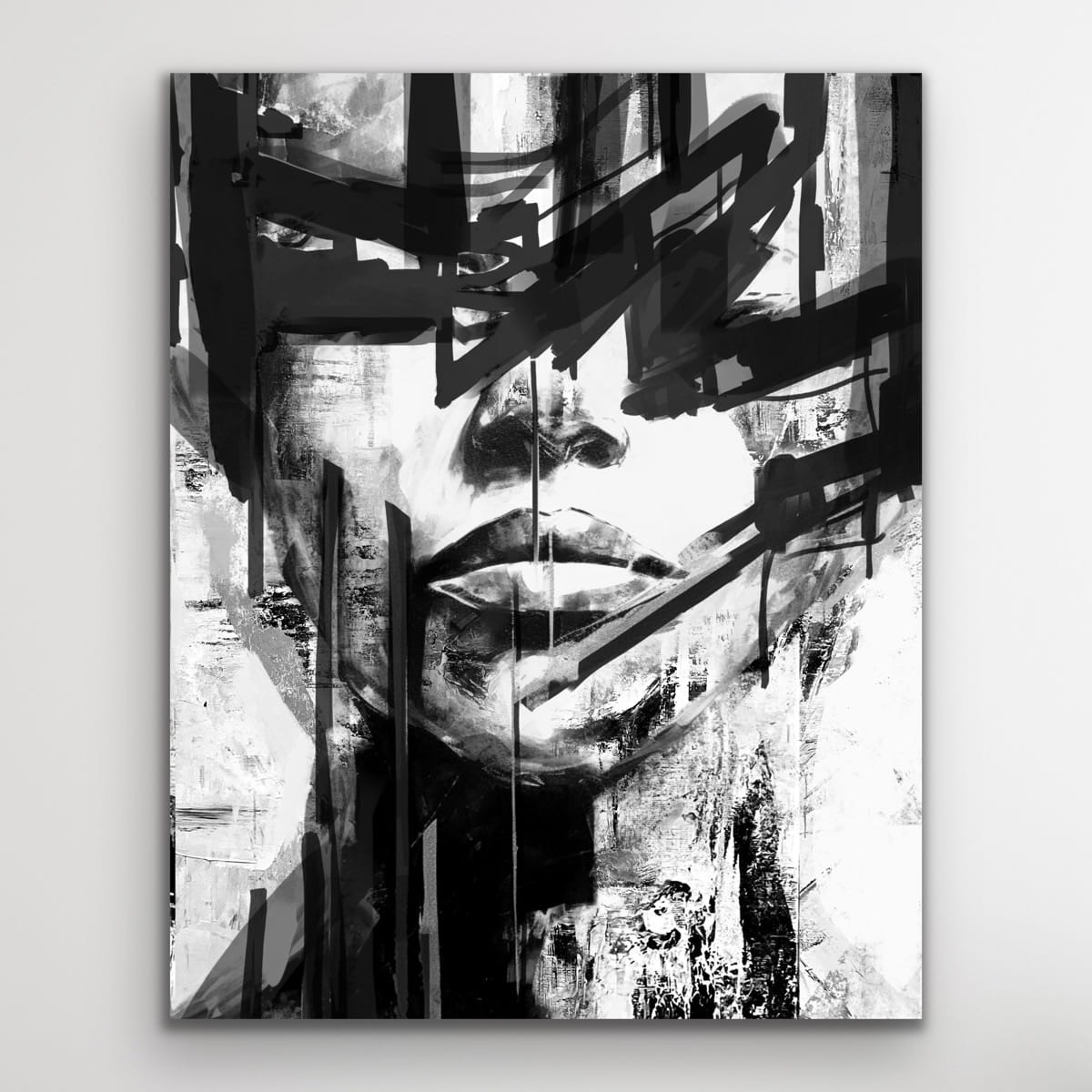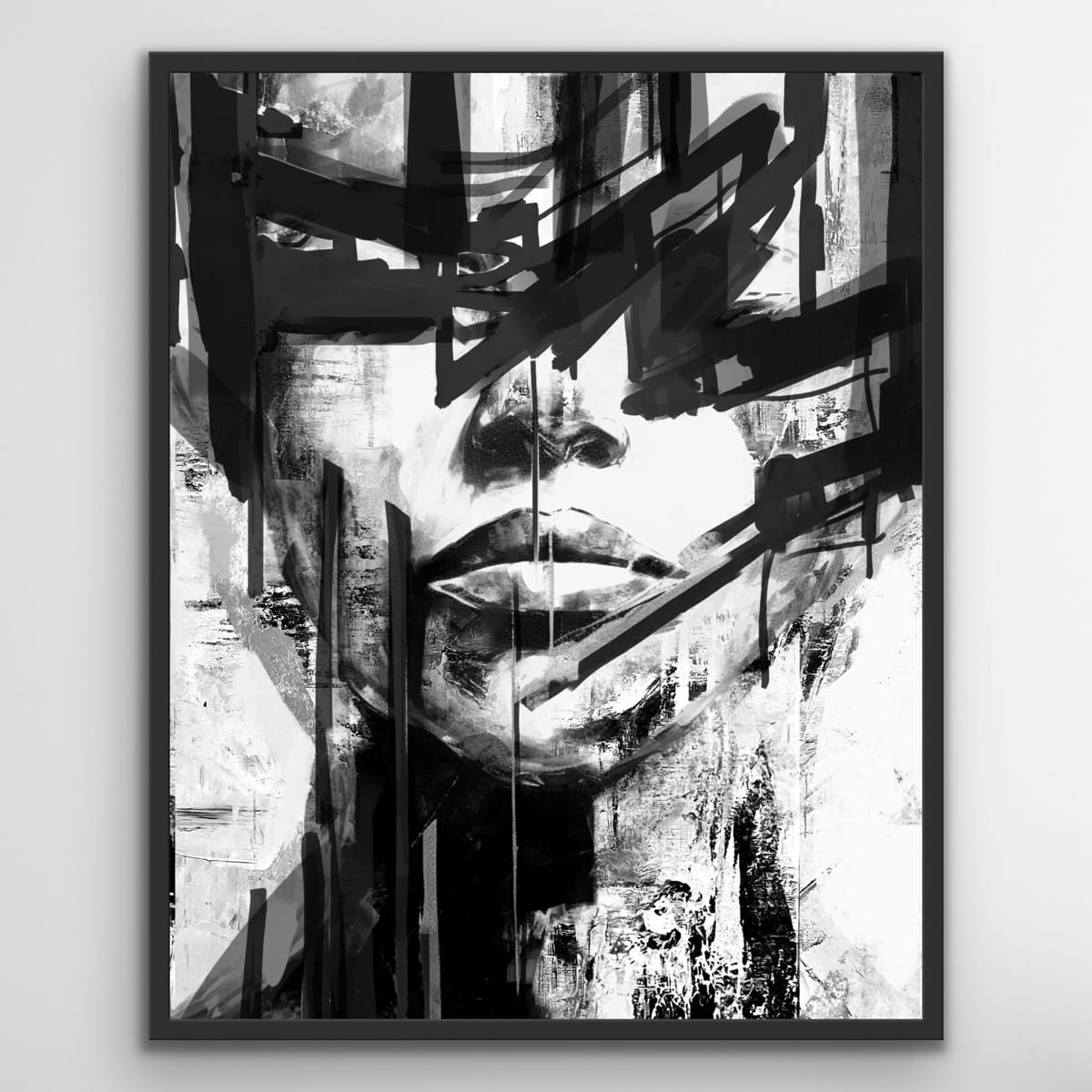 CATALYTIC vertikales schwarzes Reproduktionsbild auf Rahmen, gedruckt mit einer klaren m-Struktur