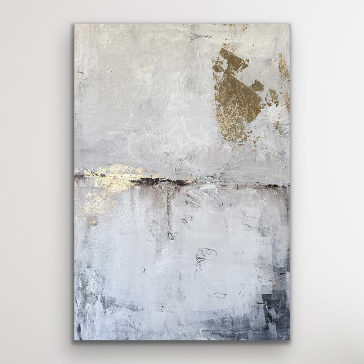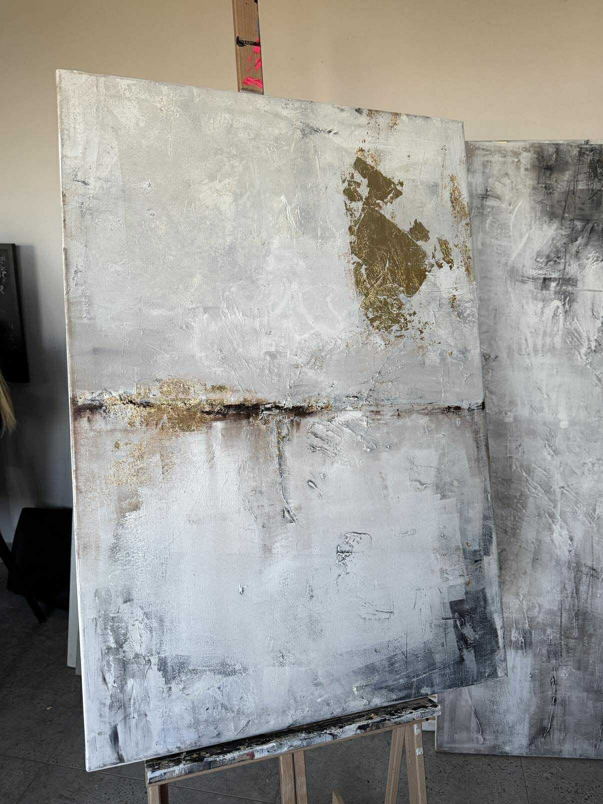 Abstraktes Ölgemälde in einer hellen, luftigen Farbpalette aus Weiß, Beige und sanften Grautönen, ergänzt durch feine goldene Akzente. Die Komposition wirkt leicht und offen, fast wie eine ruhige, atmosphärische Landschaft, in der sich Struktur und Fläche harmonisch verbinden.