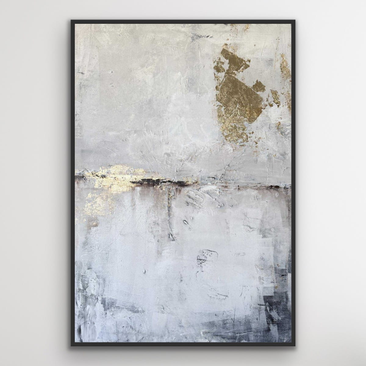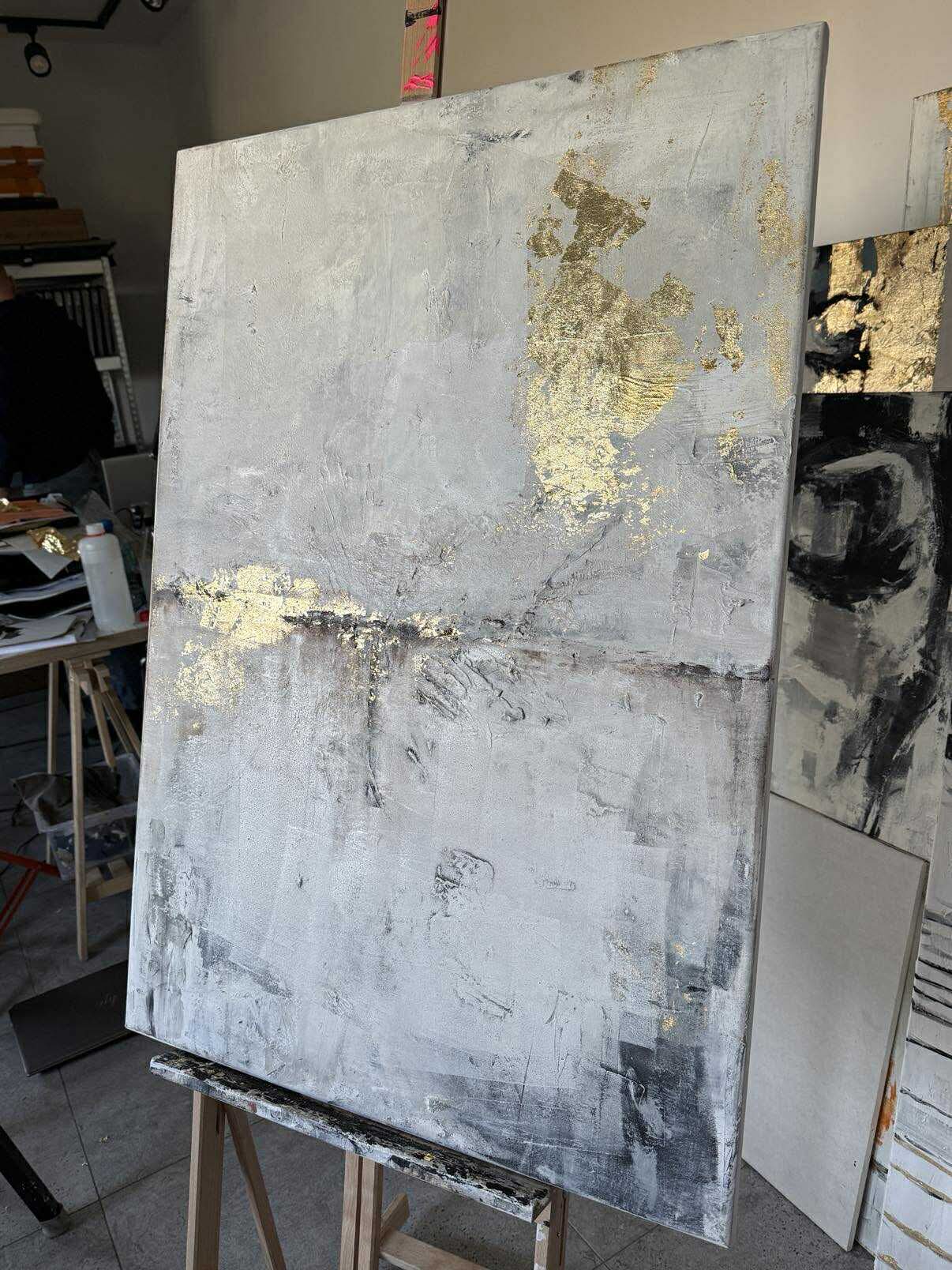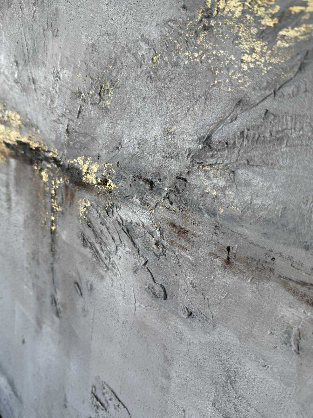 Die subtilen Schichtungen der Farbe und die sichtbare Textur verleihen dem Werk Tiefe, während die goldenen Details das Licht sanft reflektieren und eine elegante, luxuriöse Note hinzufügen. Trotz seiner Schlichtheit besitzt das Bild eine starke Präsenz und bringt Ruhe sowie Wärme in den Raum.