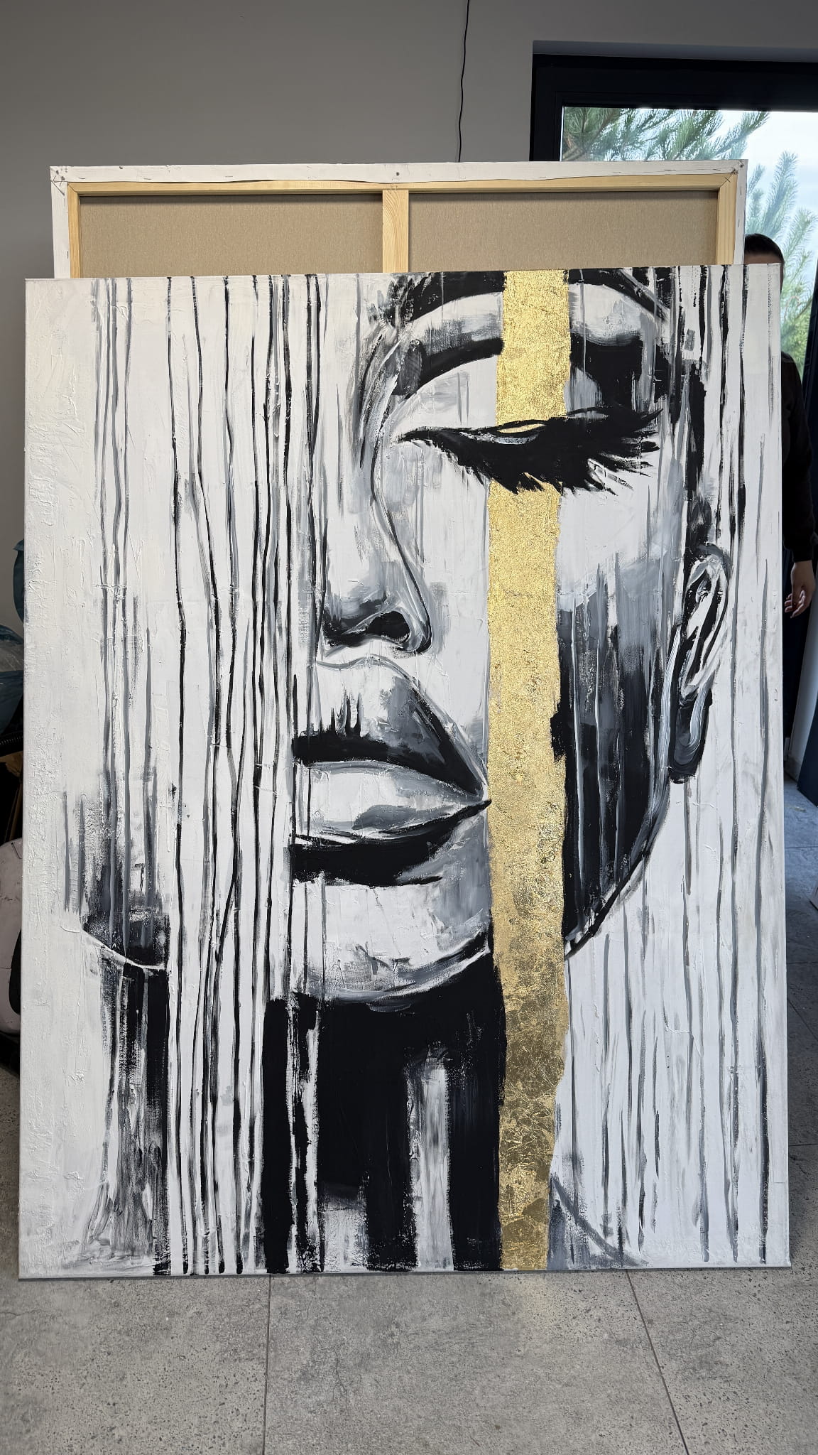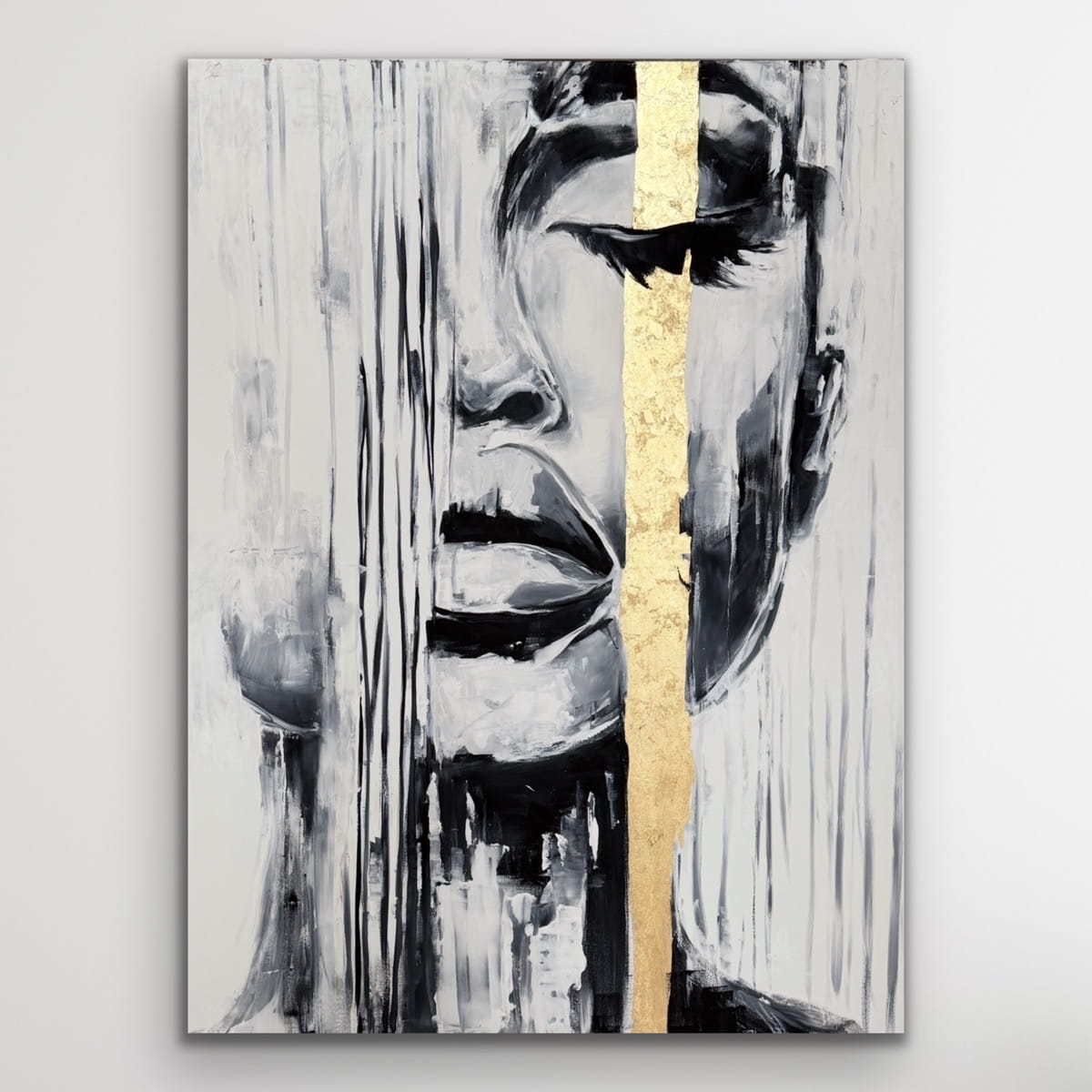 Ein außergewöhnliches Kunstwerk in einer Farbpalette aus Schwarz, Weiß und Grau, durchbrochen von einem markanten, vertikalen Akzent aus goldener Struktur. Es handelt sich um eine moderne, minimalistische Form des Porträts, bei der sanft verschwommene Gesichtszüge mit einer ausdrucksstarken Metalllinie kontrastieren und so Tiefe, Geheimnis und Luxus erzeugen.