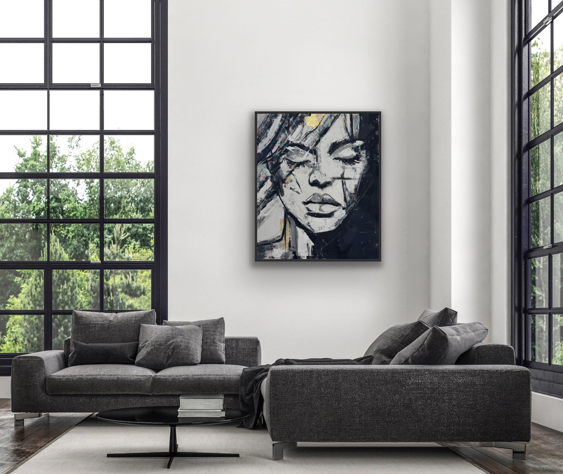 LINEARE vertikale Goldreproduktion eines Bildes auf einem Rahmen, gedruckt mit einer klaren Struktur