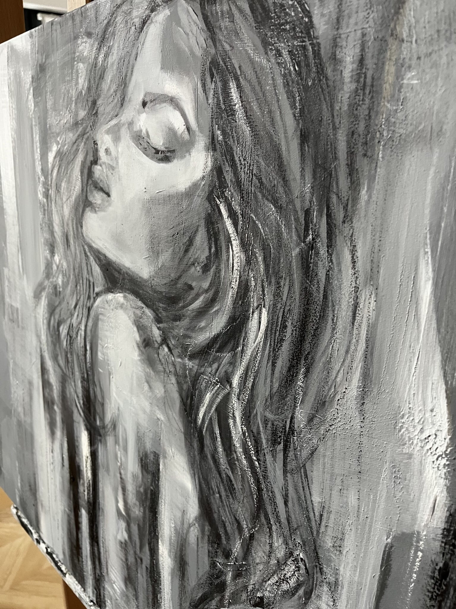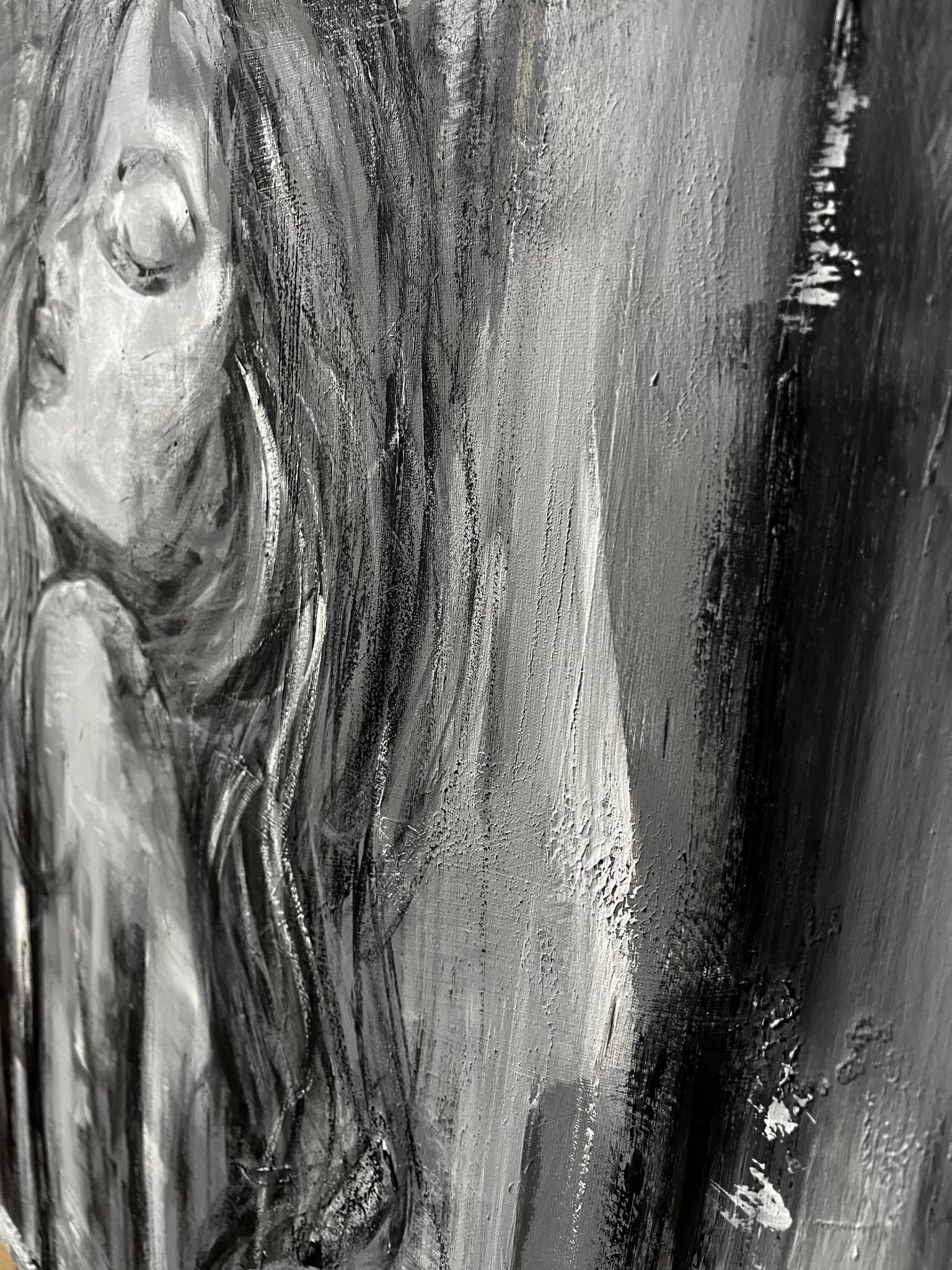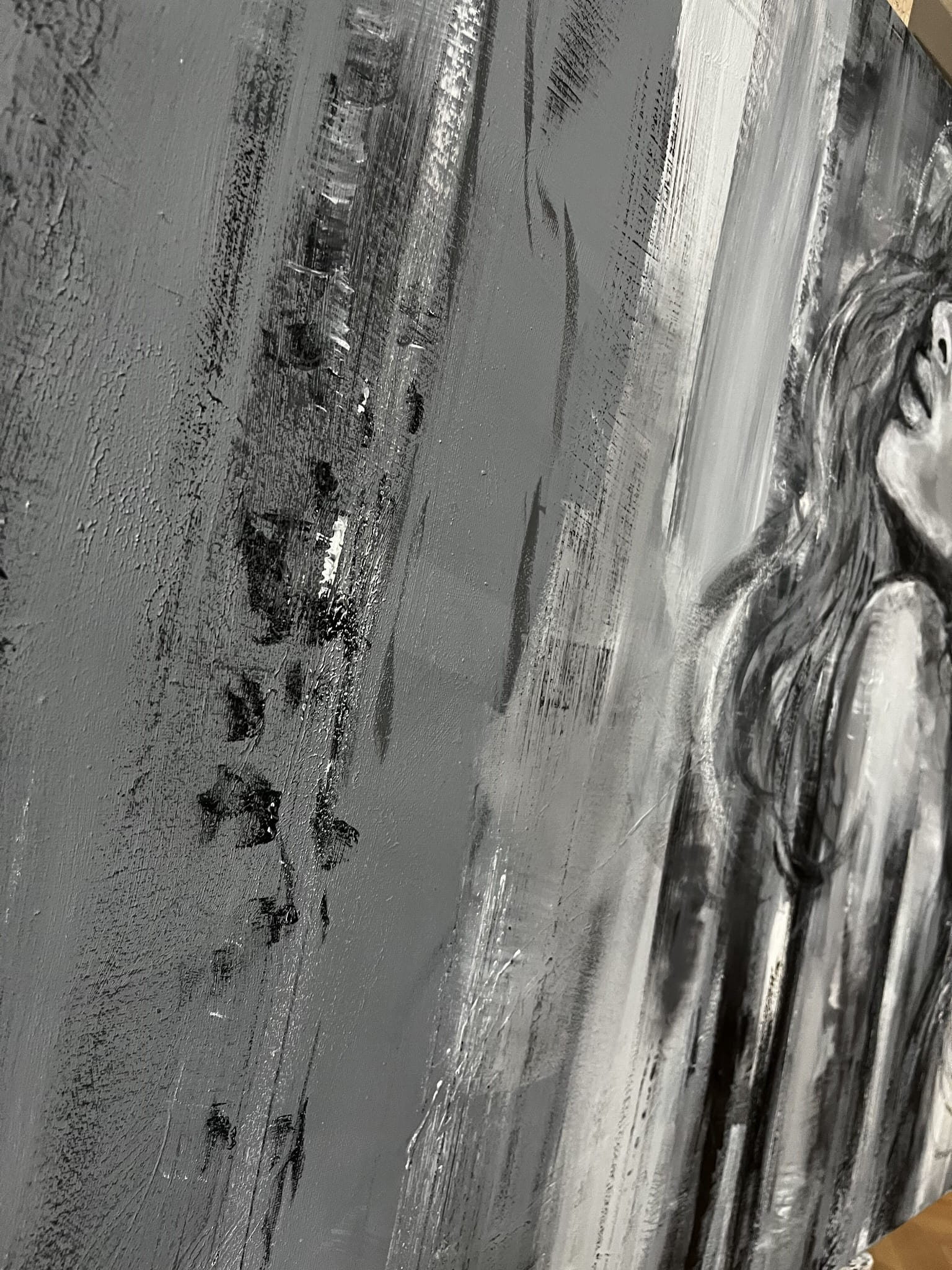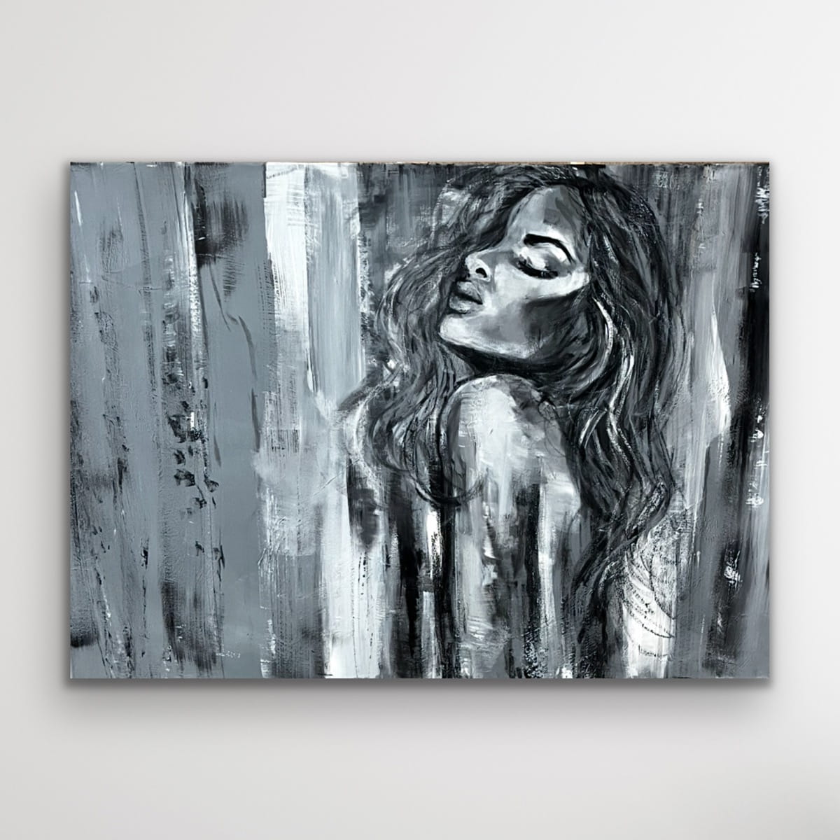 Ein außergewöhnliches Ölgemälde, in dem sich abstrakte Formen mit einer zarten, fast verschwommenen Andeutung einer weiblichen Silhouette verbinden. Die Komposition basiert auf Kontrasten von Schwarz, Weiß und kühlen Grautönen und erzeugt ein Gefühl von Tiefe, Ruhe und emotionaler Intensität. Vertikale, expressive Pinselstriche verleihen dem Werk Dynamik, während seine subtile Eleganz erhalten bleibt.