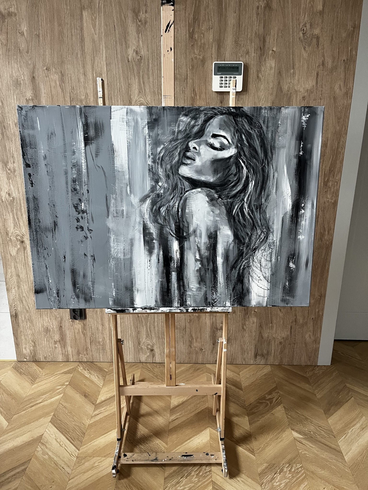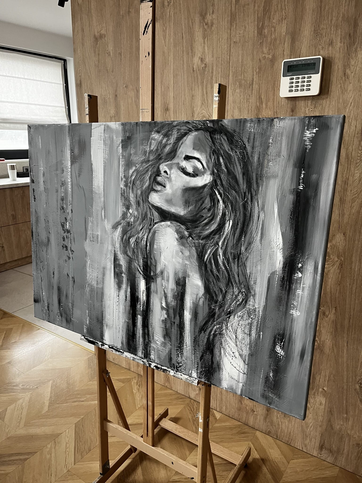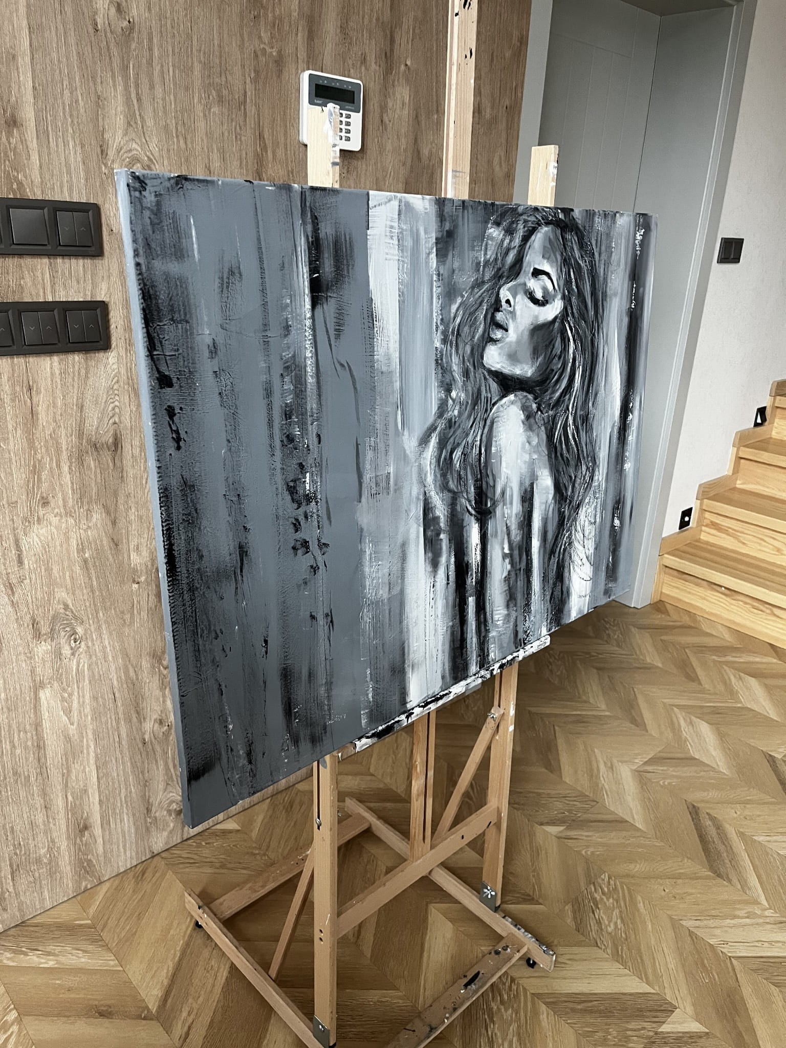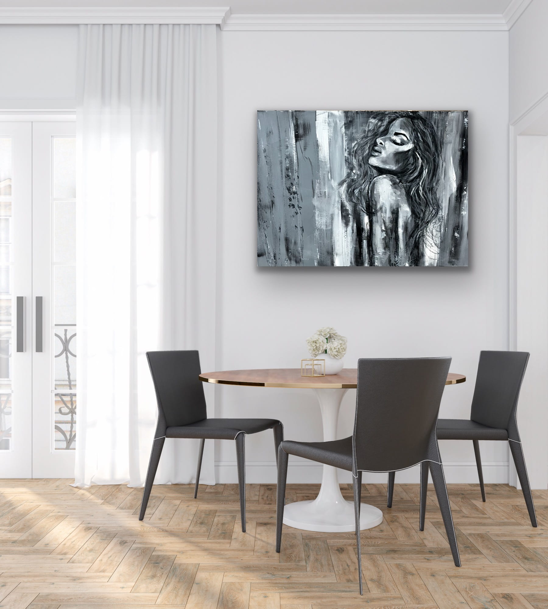 Ein außergewöhnliches Ölgemälde, in dem sich abstrakte Formen mit einer zarten, fast verschwommenen Andeutung einer weiblichen Silhouette verbinden. Die Komposition basiert auf Kontrasten von Schwarz, Weiß und kühlen Grautönen und erzeugt ein Gefühl von Tiefe, Ruhe und emotionaler Intensität. Vertikale, expressive Pinselstriche verleihen dem Werk Dynamik, während seine subtile Eleganz erhalten bleibt.