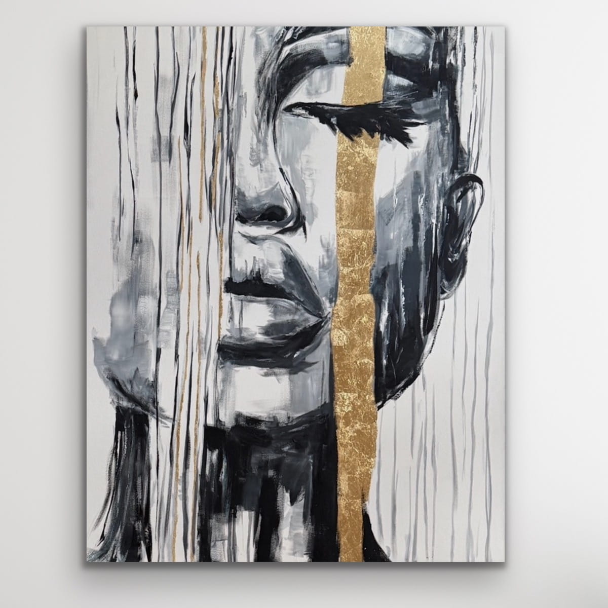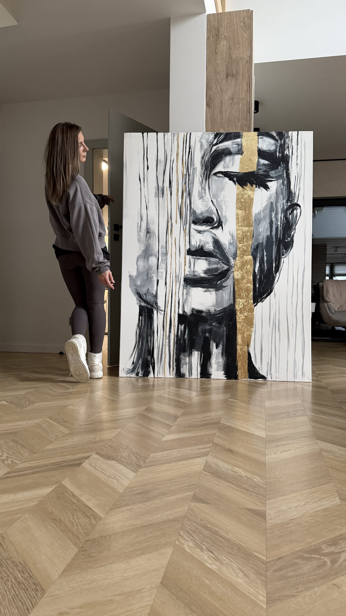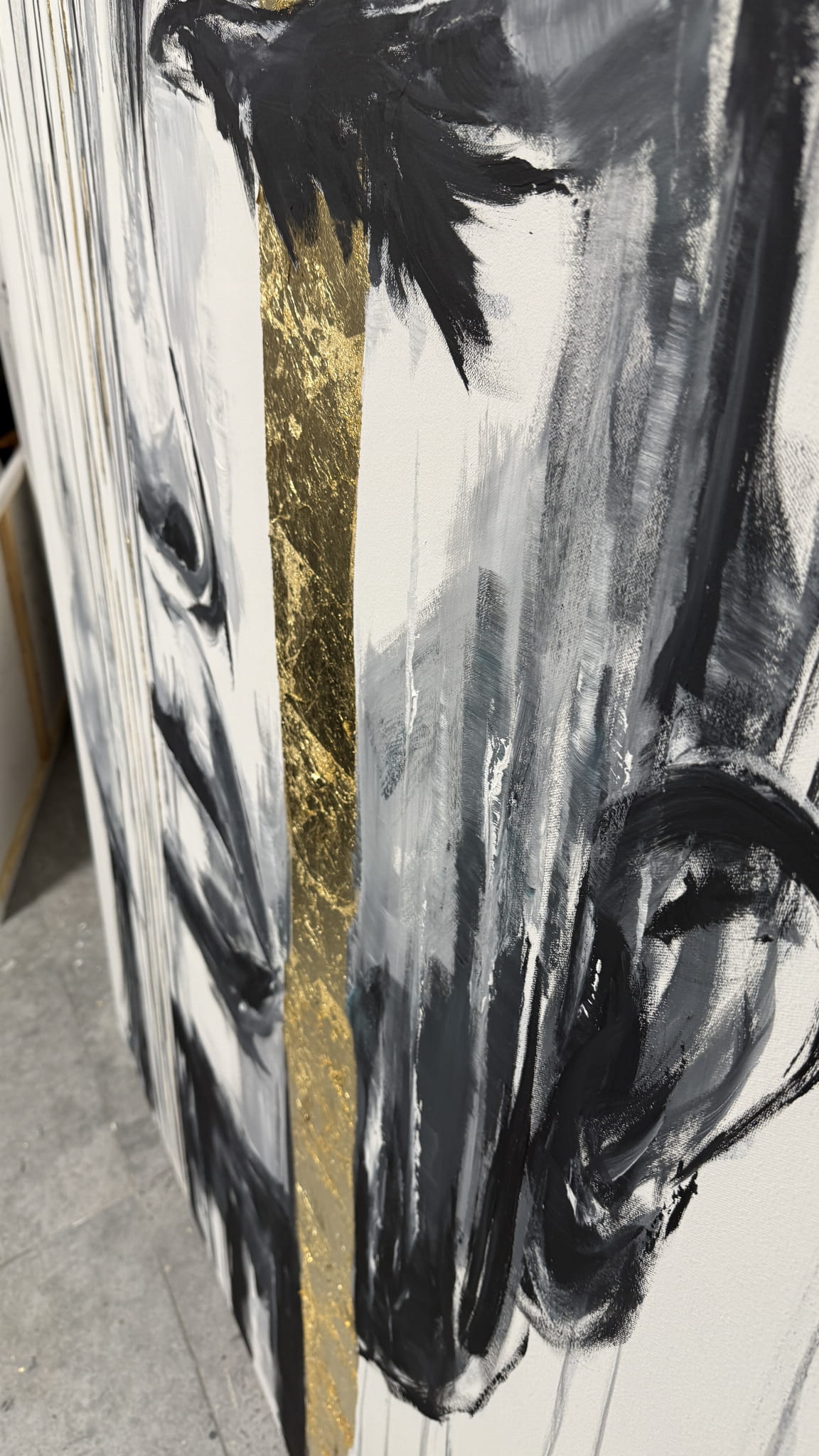 Ten diptyk to połączenie czerni, bieli i złota – kontrastu, który buduje napięcie, ale jednocześnie niesie spokój.
