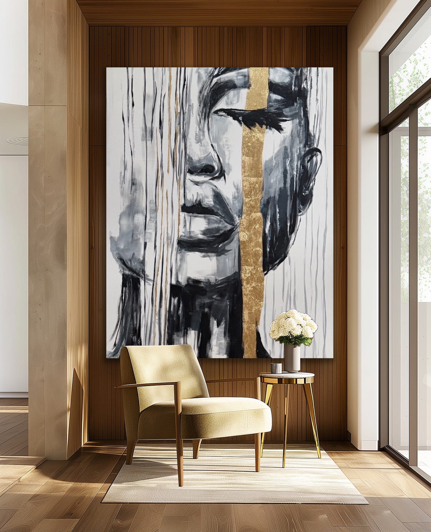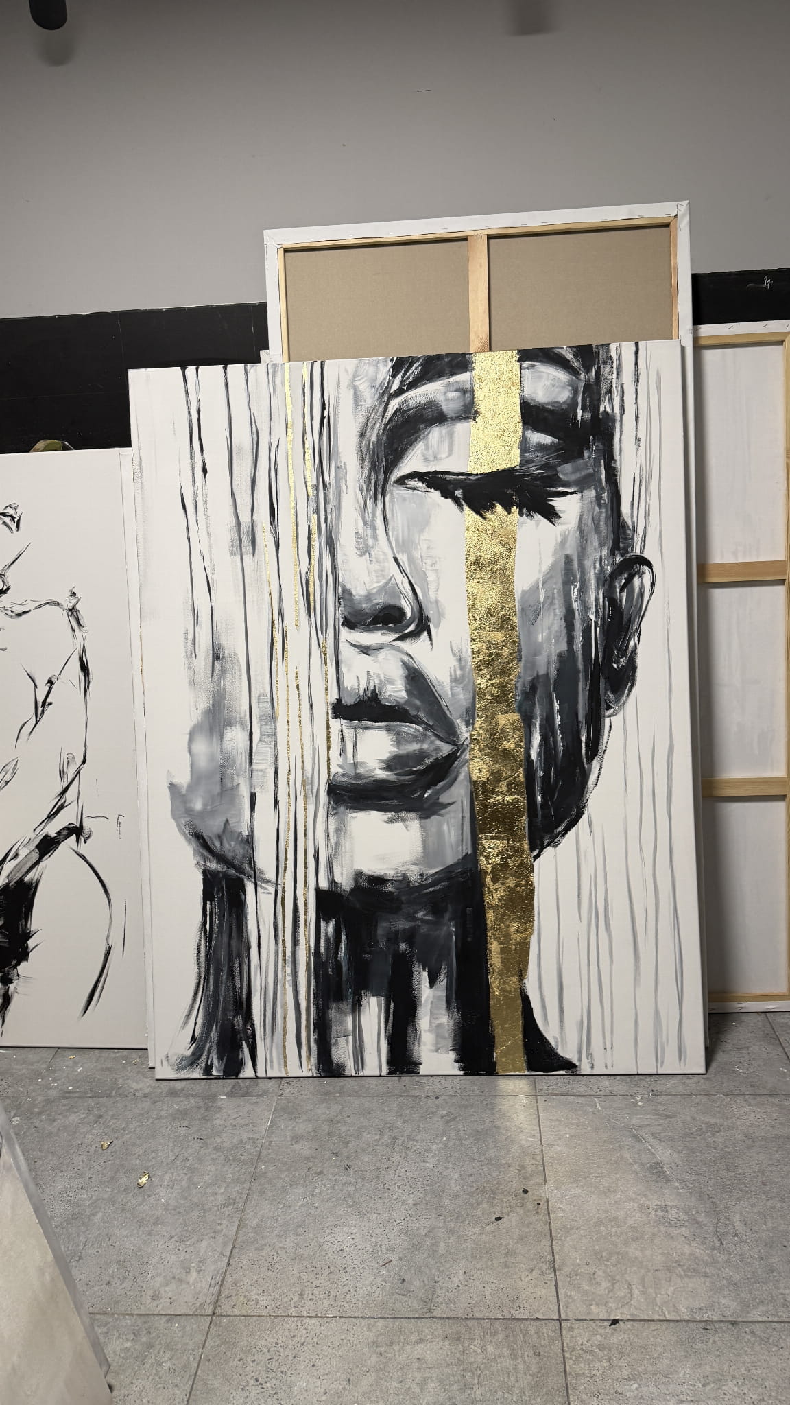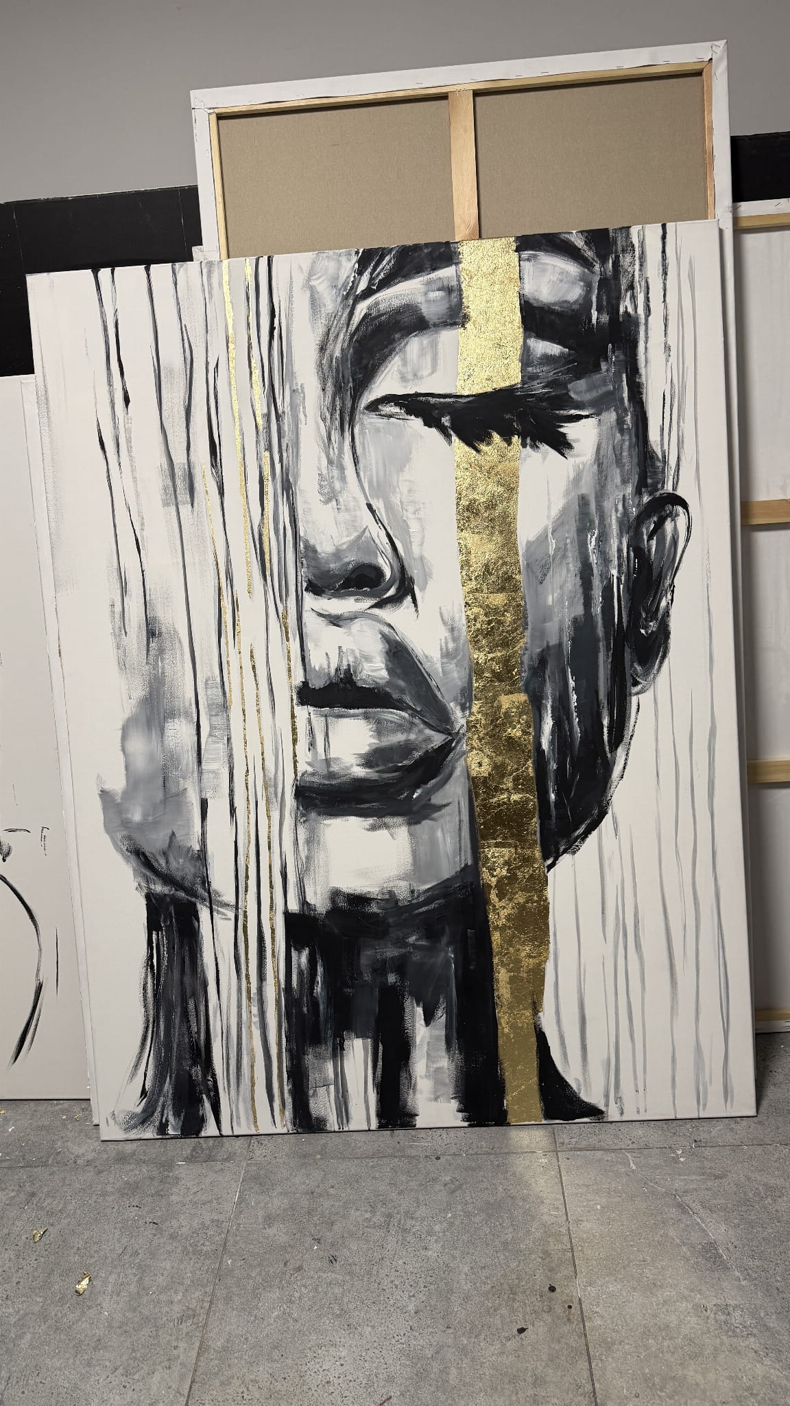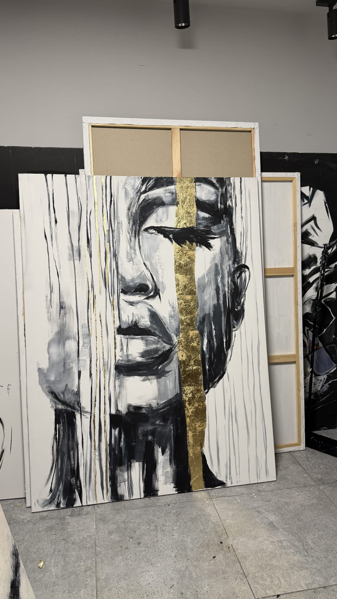 Ten diptyk to połączenie czerni, bieli i złota – kontrastu, który buduje napięcie, ale jednocześnie niesie spokój.