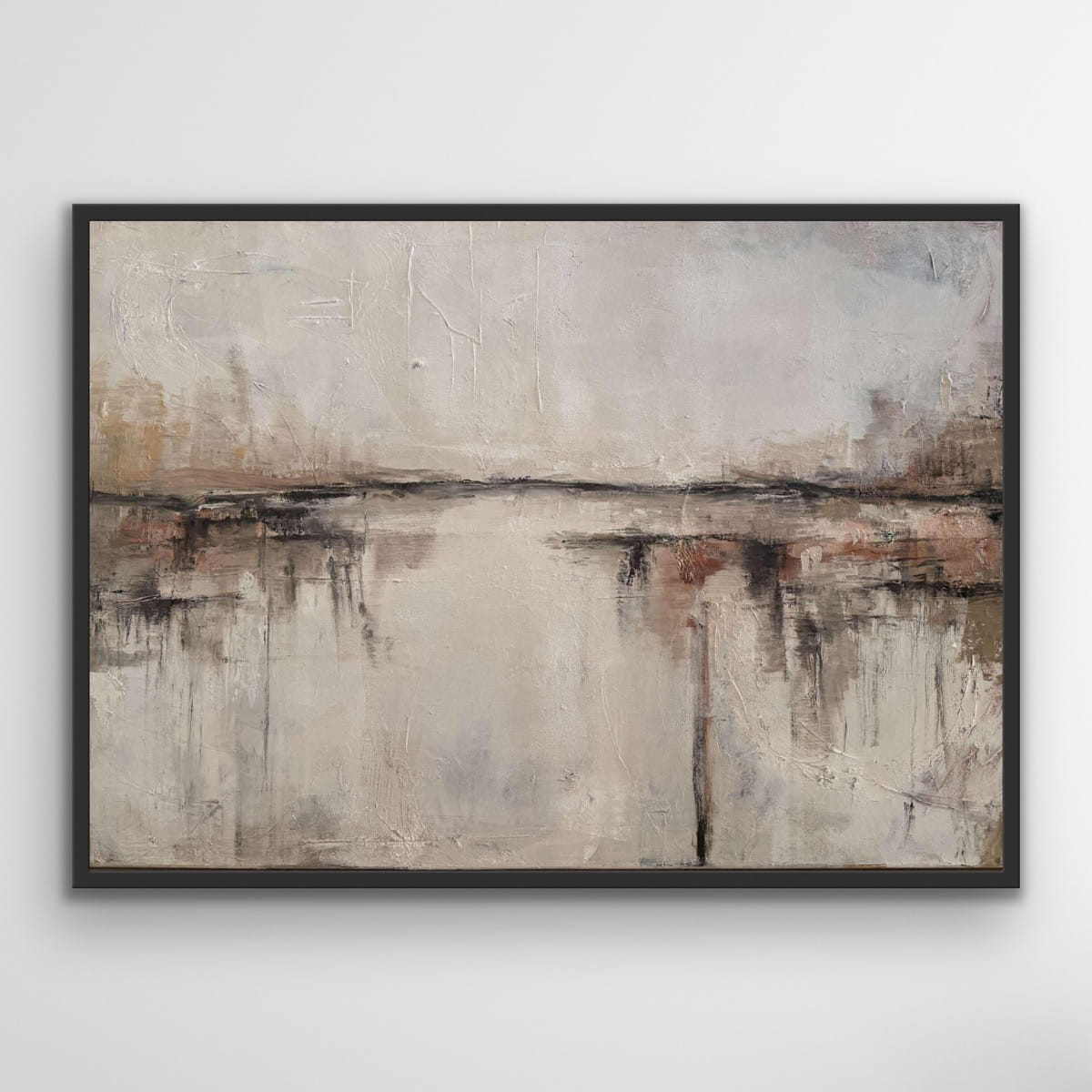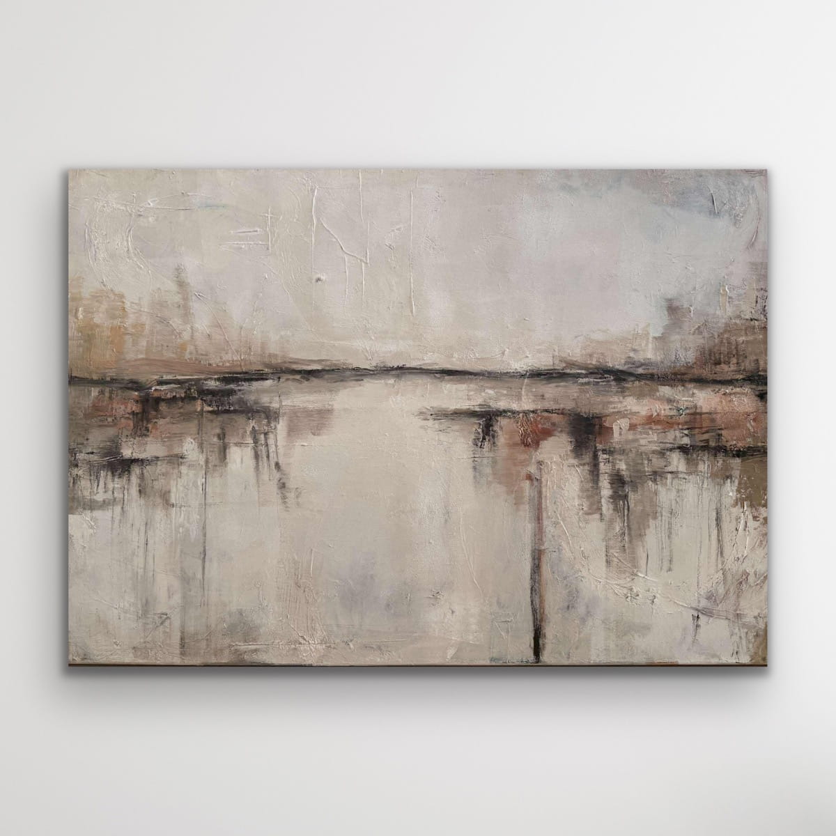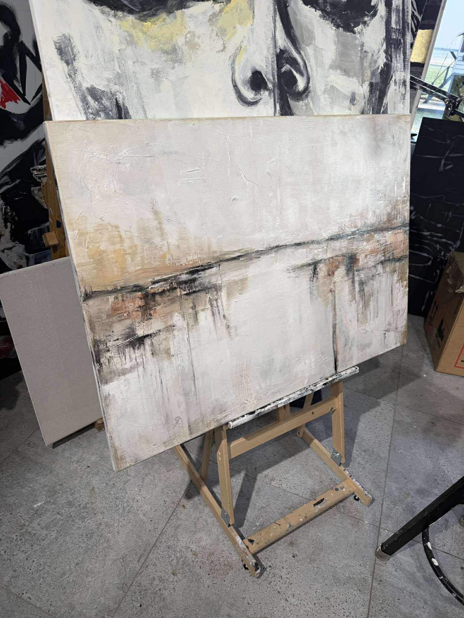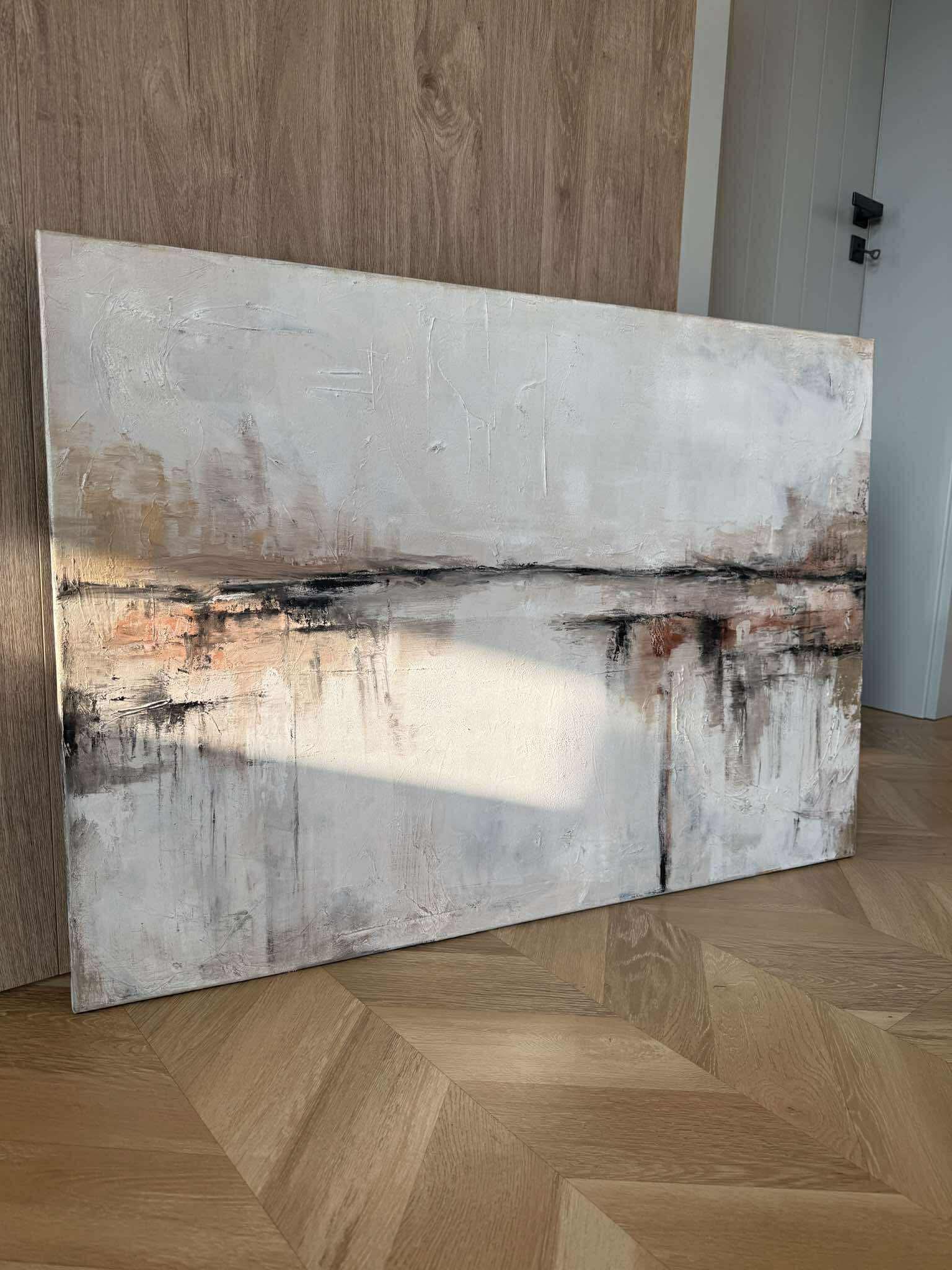 Abstraktes Ölgemälde in einer ruhigen, erdigen Farbpalette aus Beige, Grau und gebrochenem Weiß. Sanfte horizontale Übergänge und feine lineare Akzente schaffen ein Gefühl von Weite, Stille und natürlicher Balance. Die strukturierte Oberfläche verleiht dem Werk Tiefe, während seine reduzierte Eleganz durch ihre Schlichtheit überzeugt.