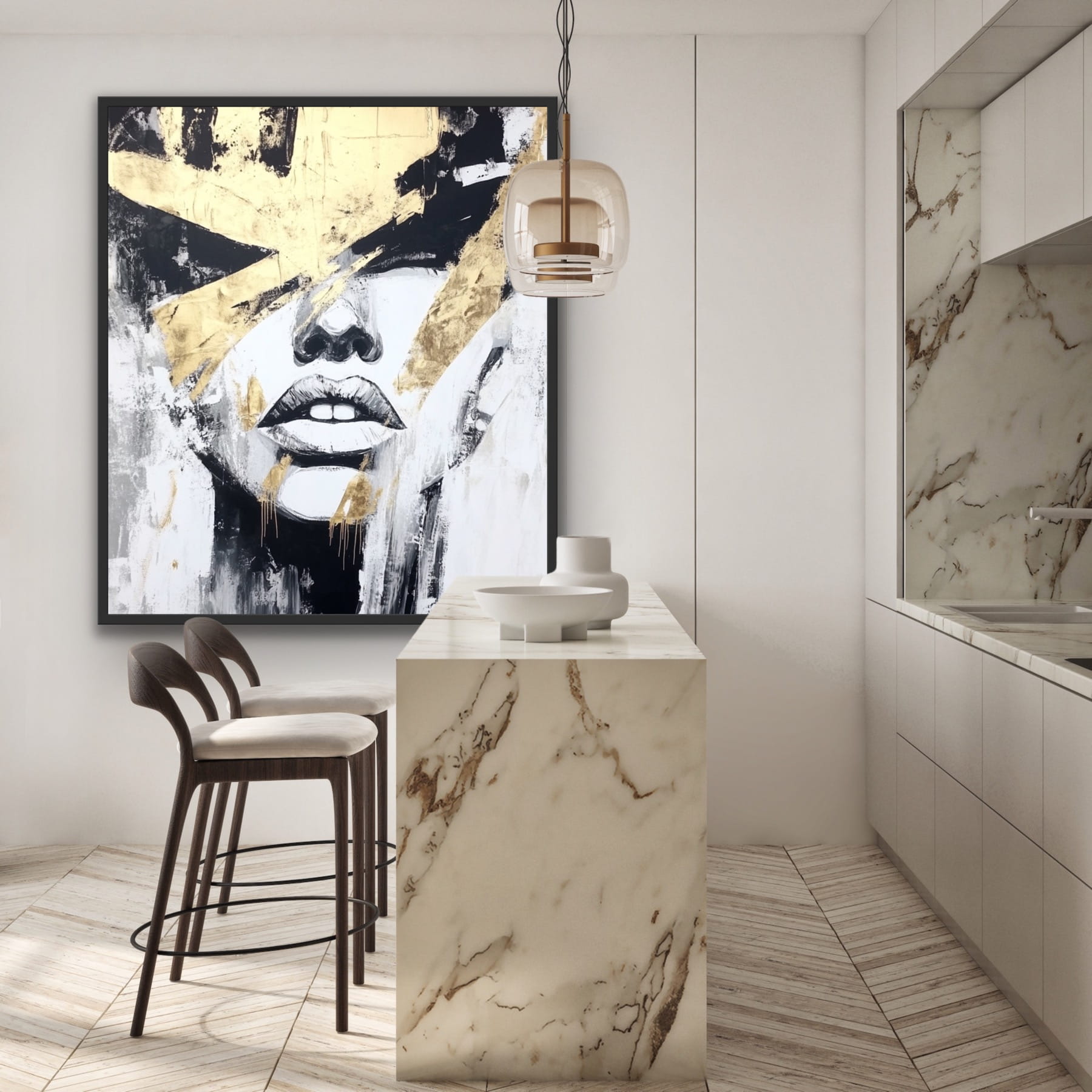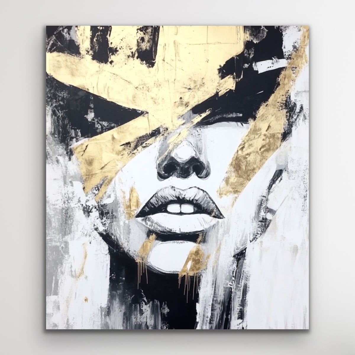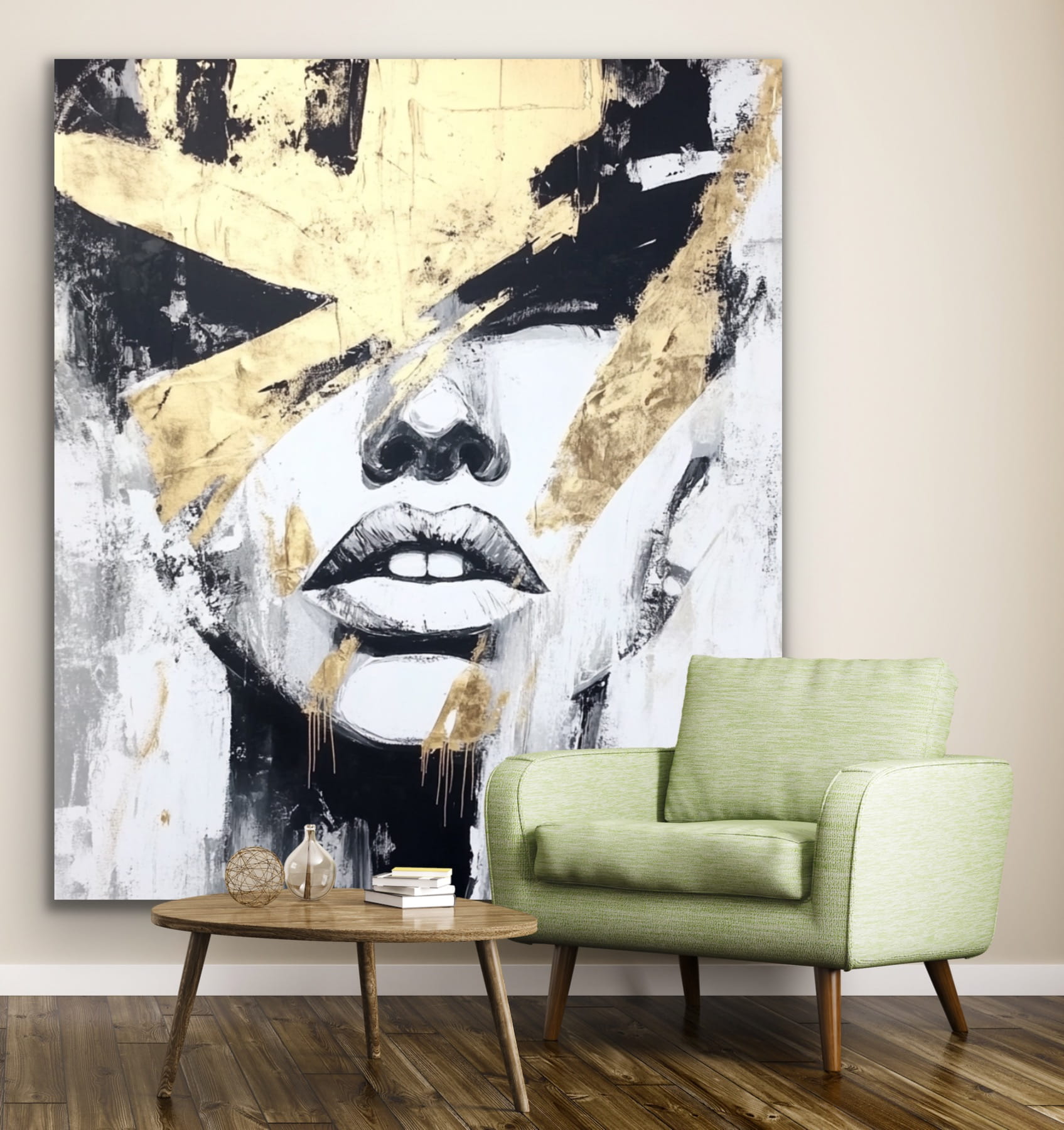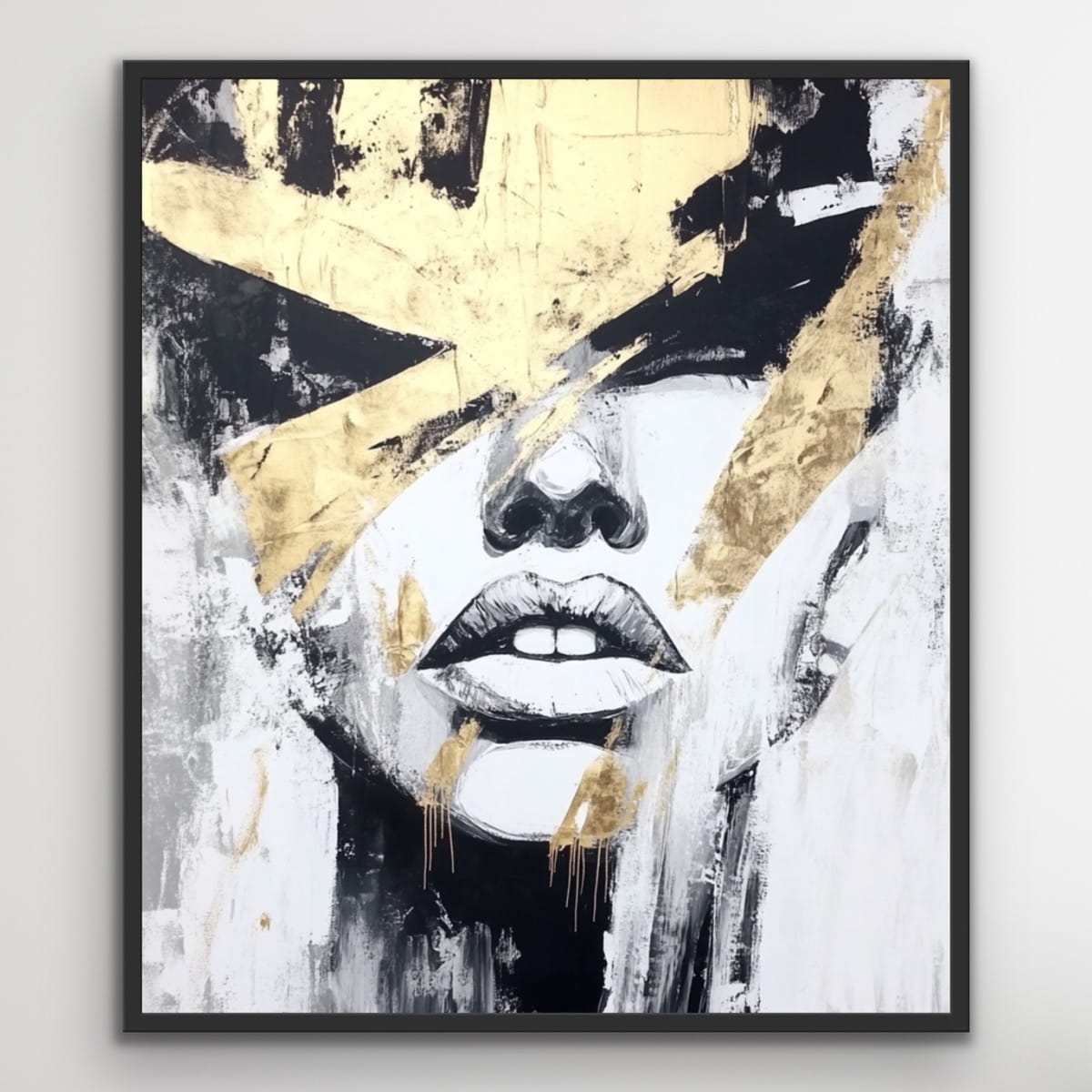 SHOWCASE: Vertikale Goldreproduktion eines Gemäldes auf einem Rahmen, bedruckt mit einer klaren Struktur