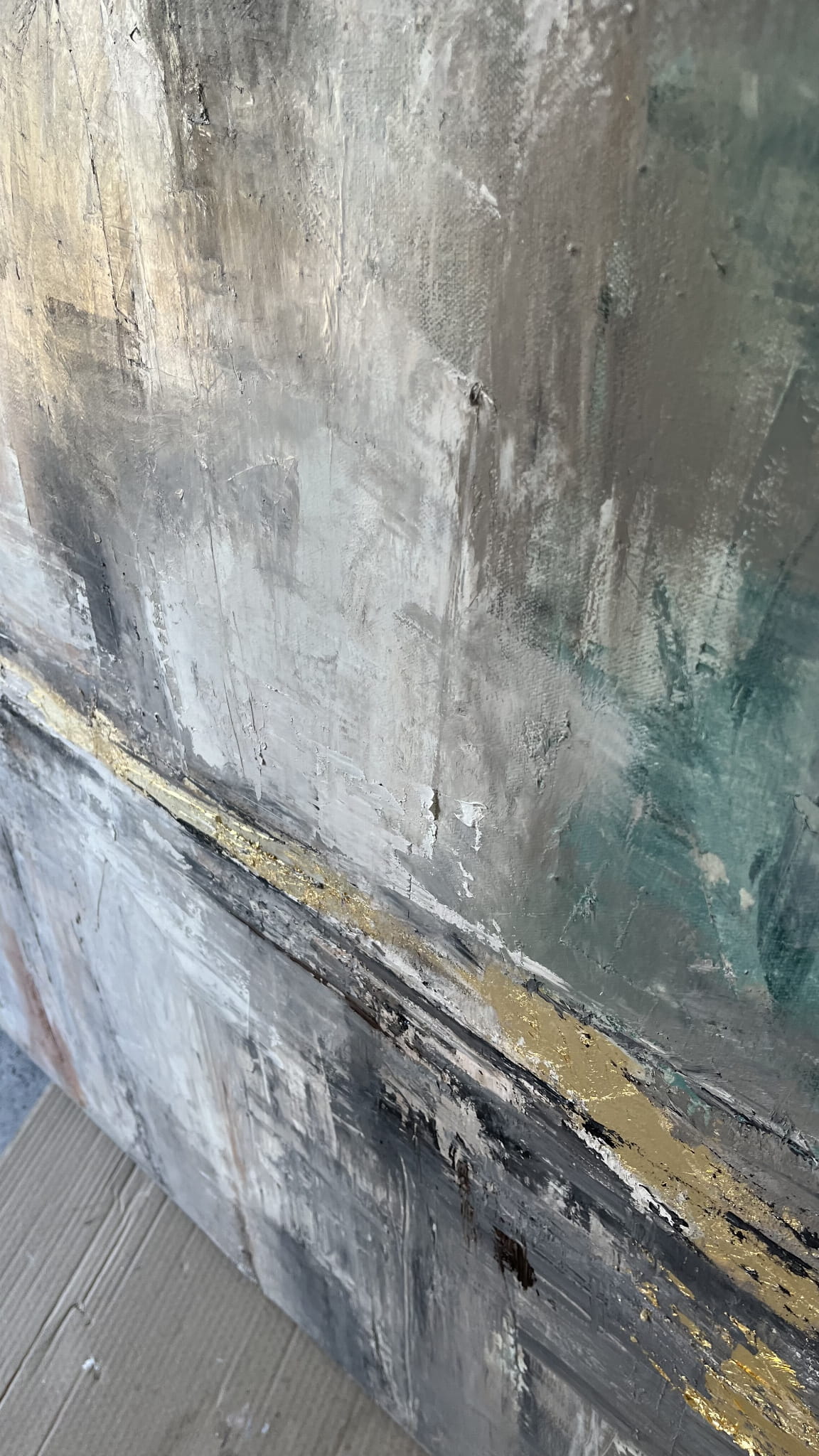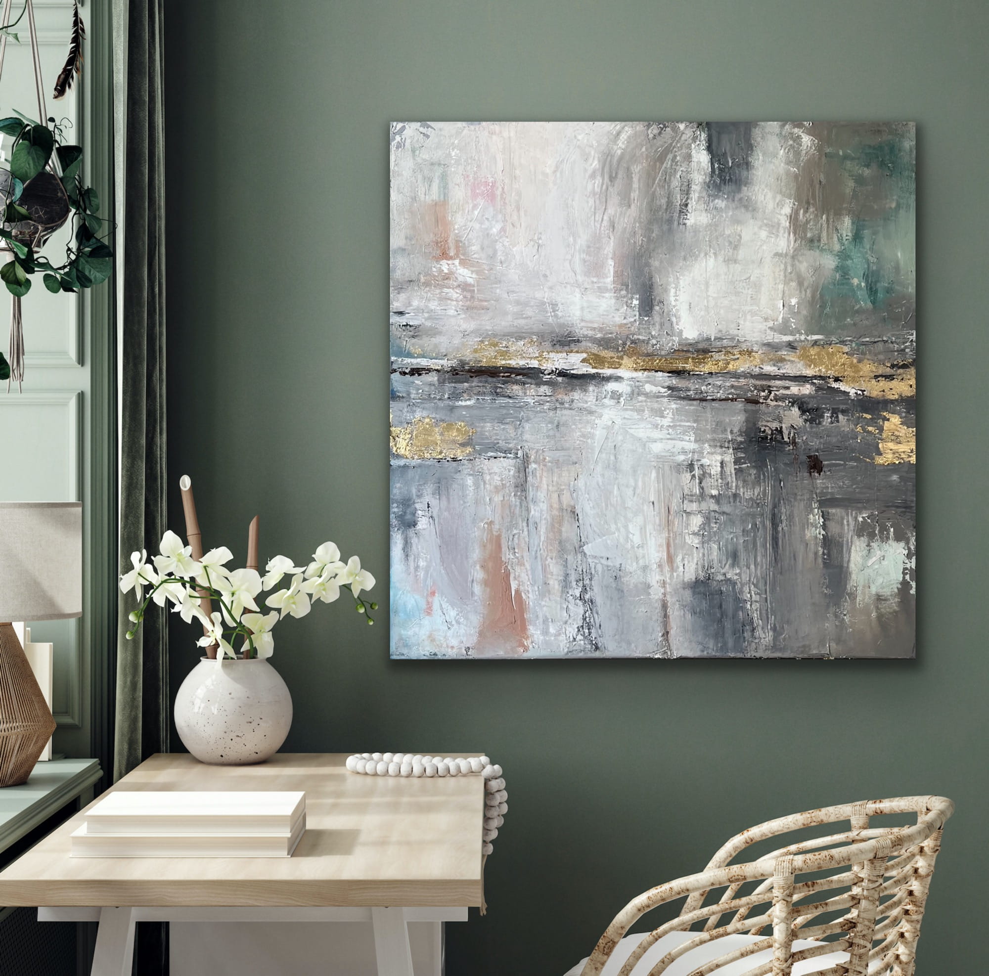 Malowany techniką farb olejnych z efektem delikatnej struktury, wykończenie w macie.