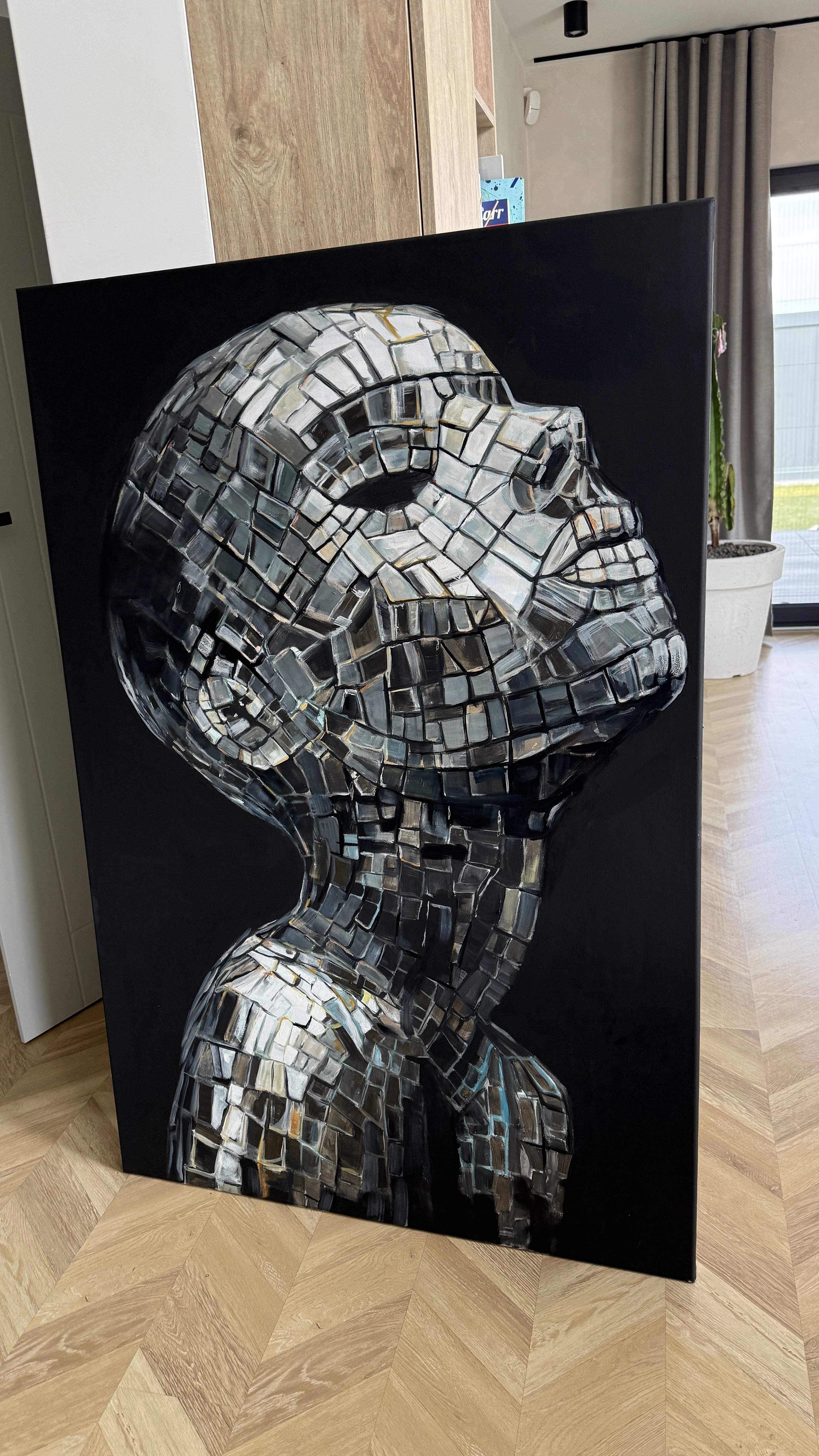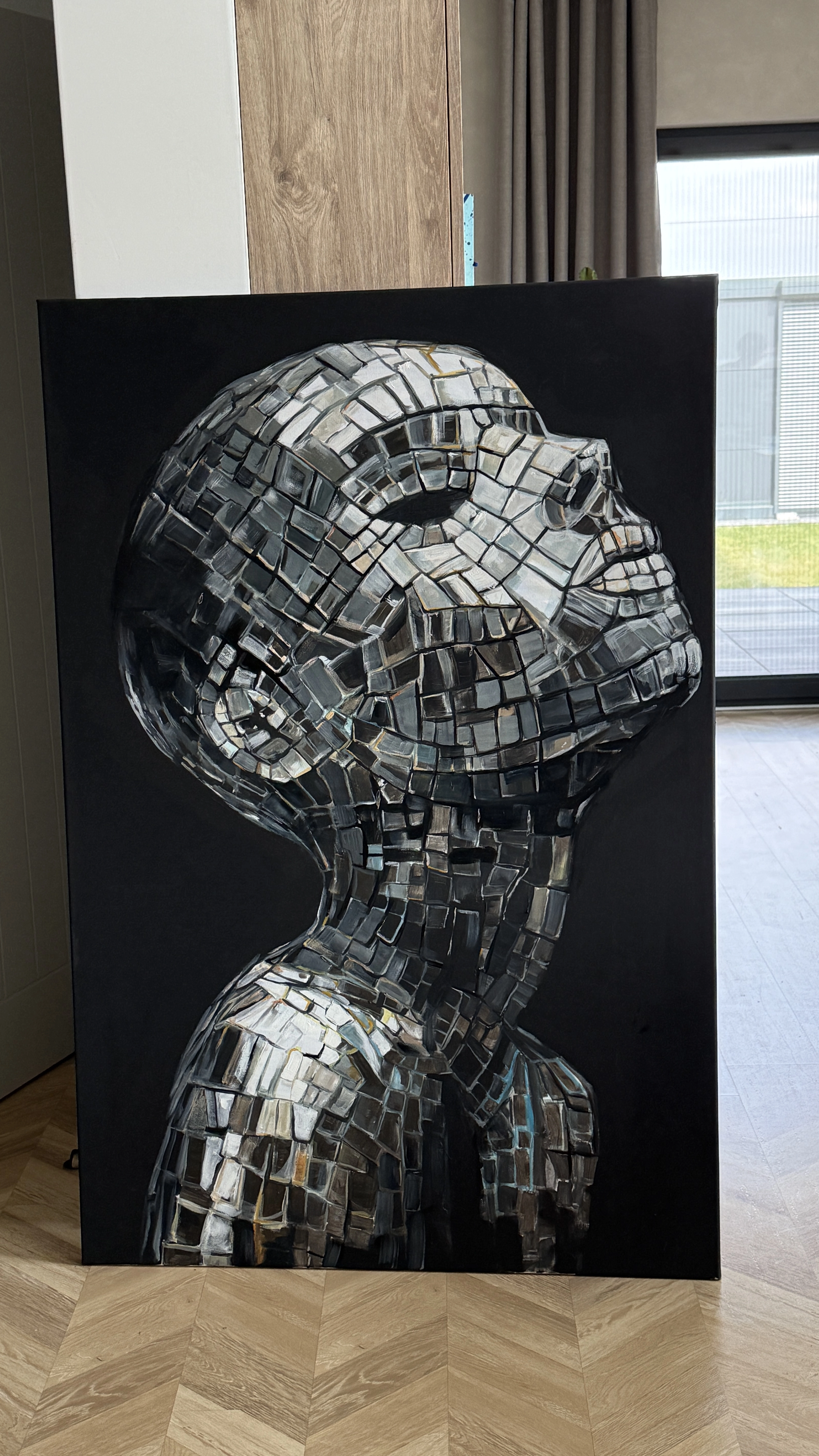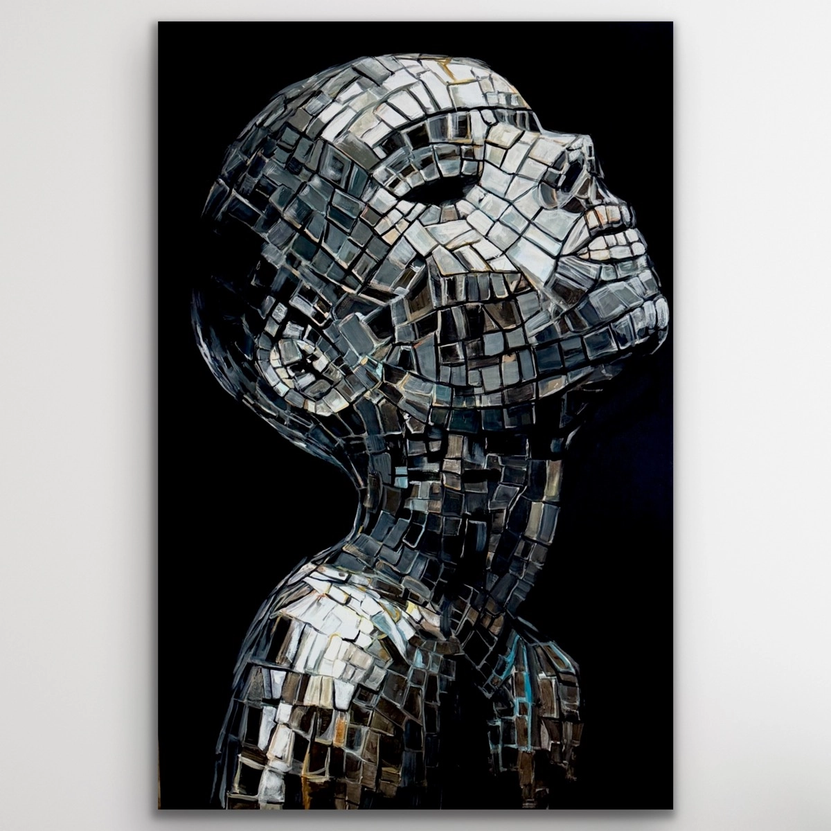 Obraz przedstawia sylwetkę człowieka zbudowaną z setek drobnych, lustrzanych form. Każdy element odbija światło inaczej, tworząc dynamiczną, niemal żywą strukturę. To opowieść o tożsamości – złożonej, niejednoznacznej, zmiennej.