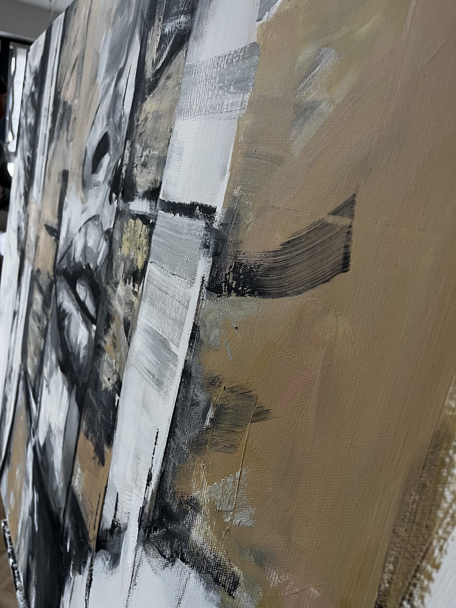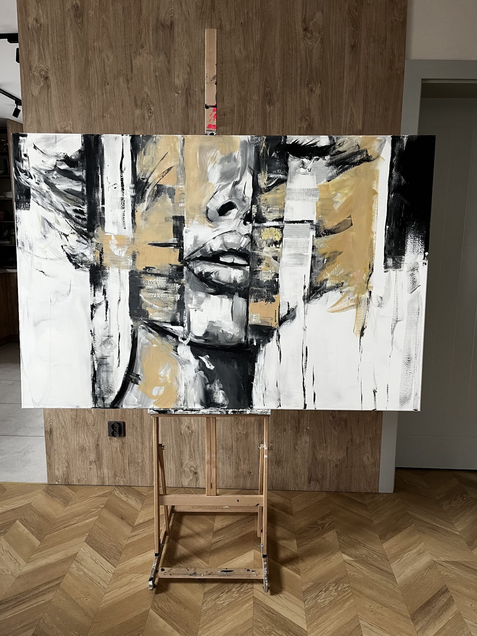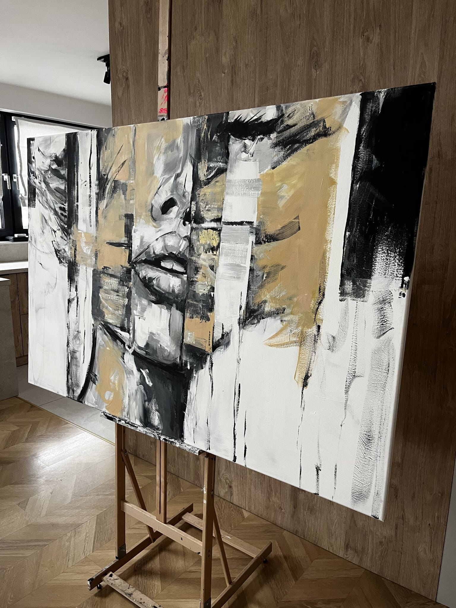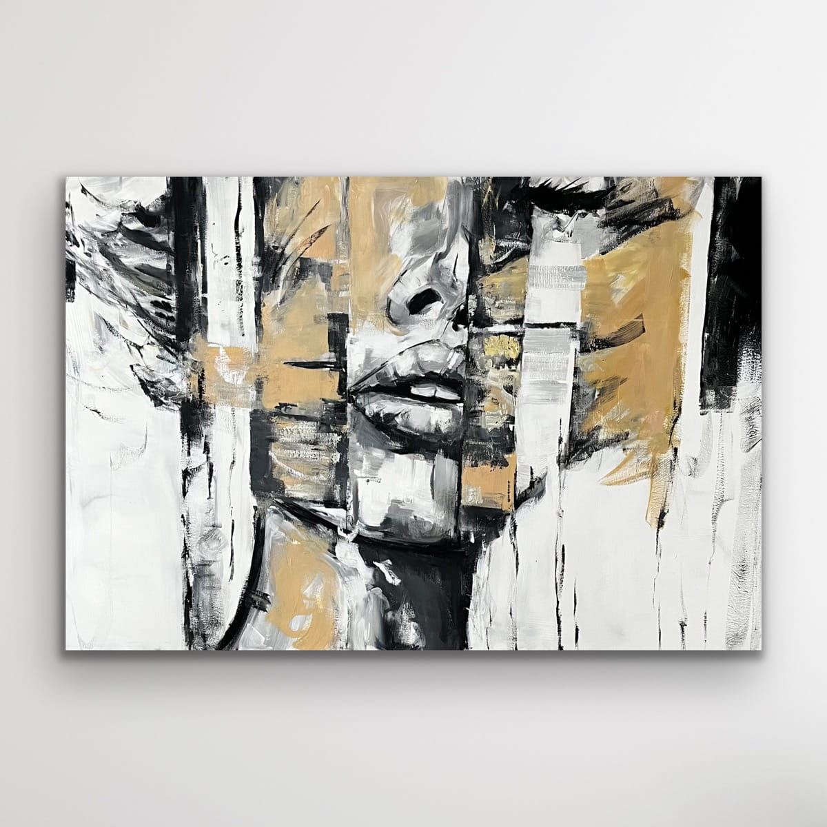 Mocny, graficzny portret o ikonicznej formie, w którym kontrasty i rytm plam tworzą wyrazistą kompozycję. To nowoczesna interpretacja kobiecej siły i obecności, która nie pozostaje niezauważona.