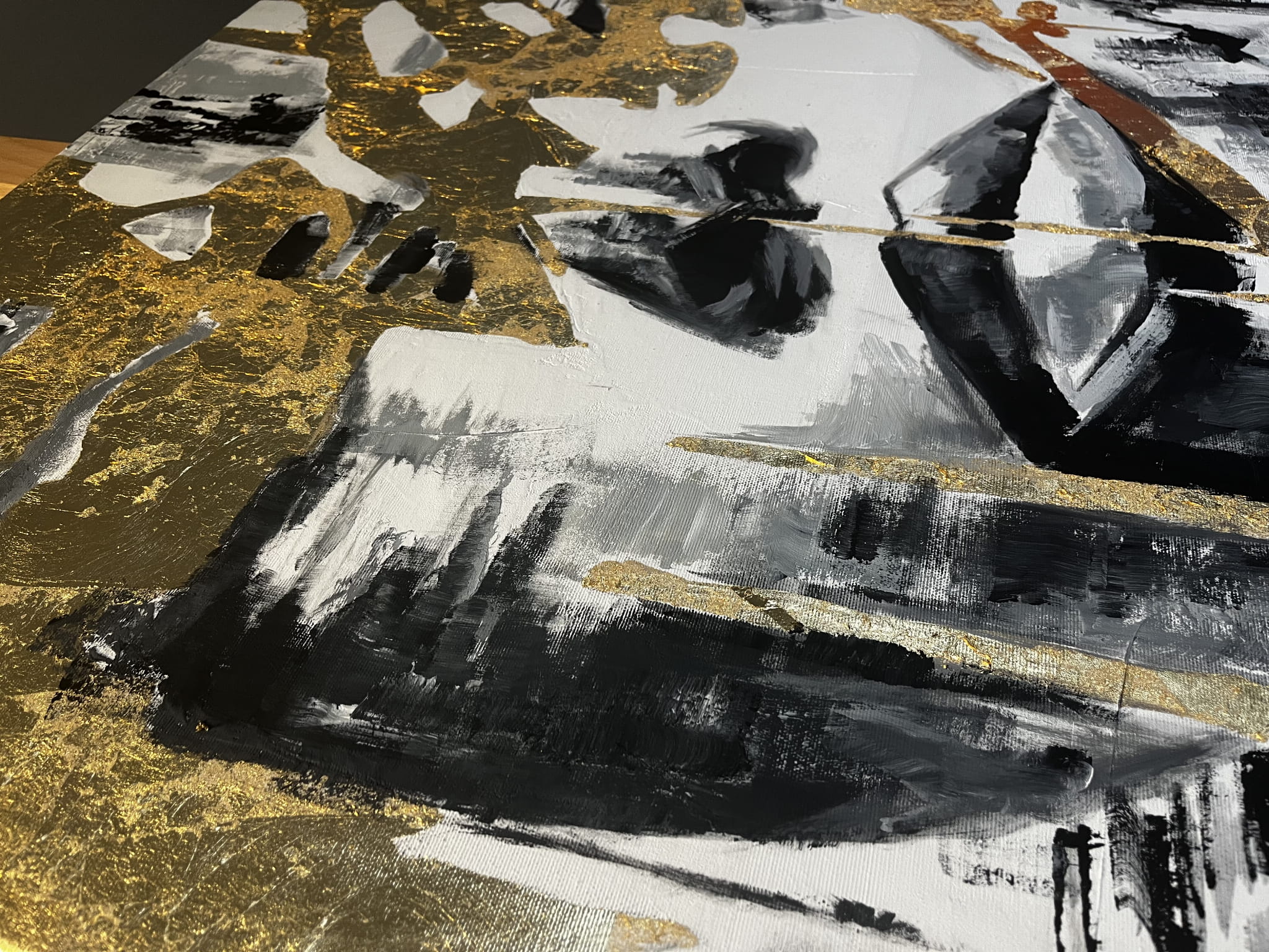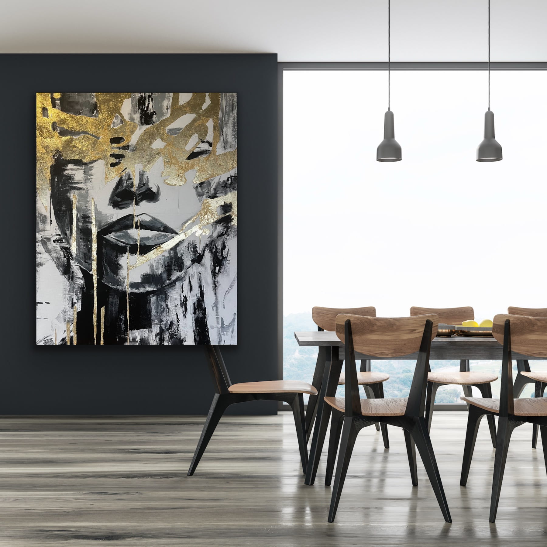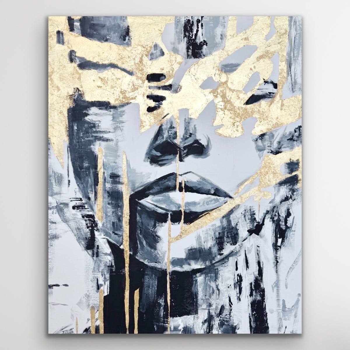 Nowoczesna, ekspresyjna kompozycja przedstawiająca stylizowaną twarz wyłaniającą się z dynamicznych pociągnięć czerni, bieli i szarości, przełamanych błyszczącymi złotymi akcentami. Złote linie i struktury nadają całości elegancki, luksusowy charakter, a kontrast z surową monochromatyczną paletą tworzy efekt głębi i dramatyzmu.