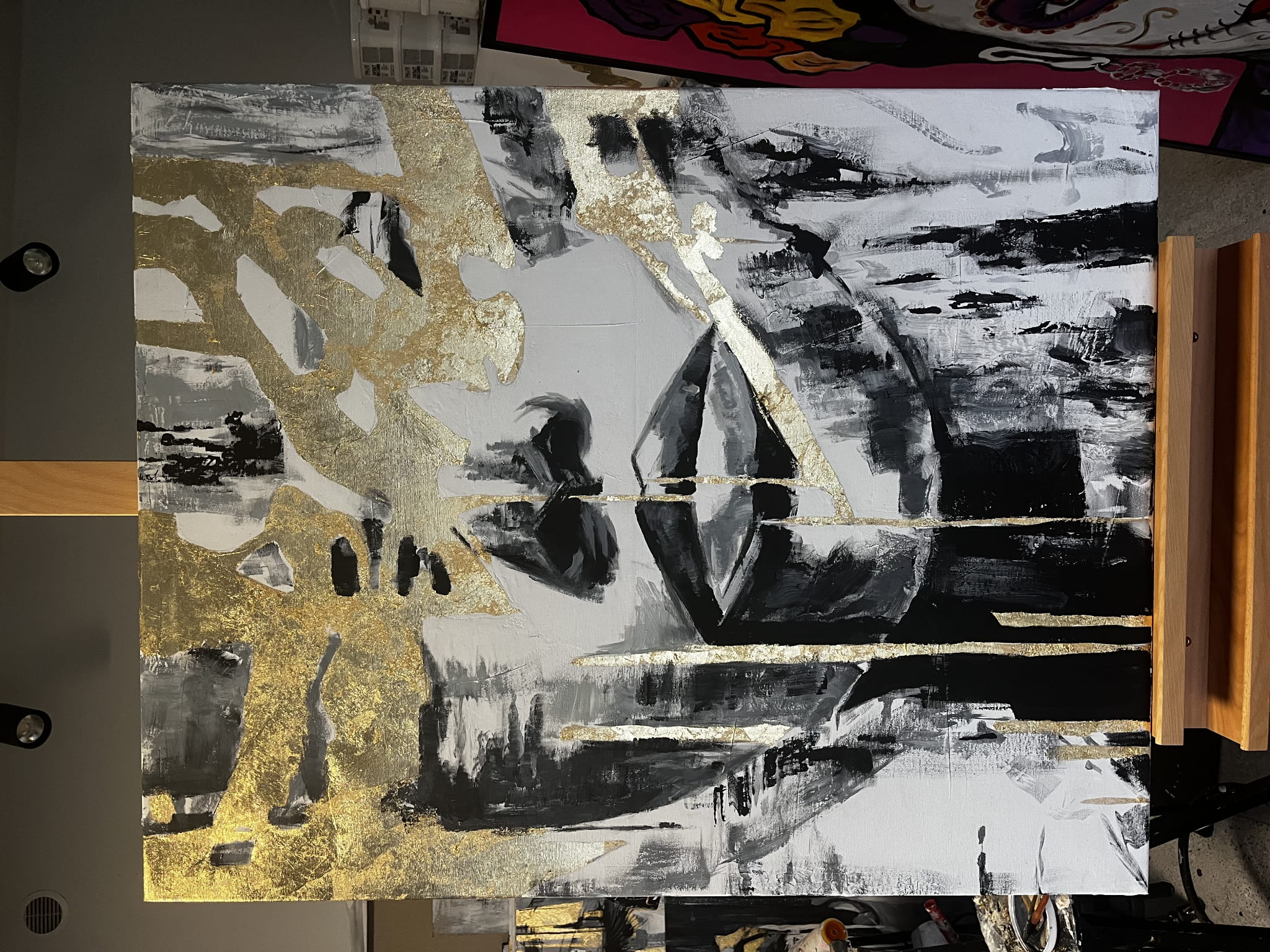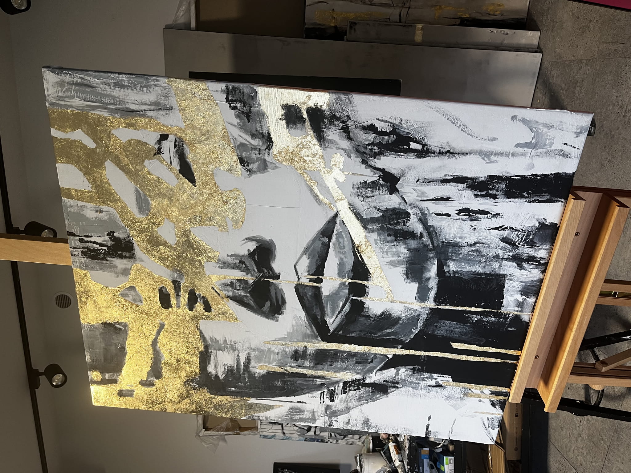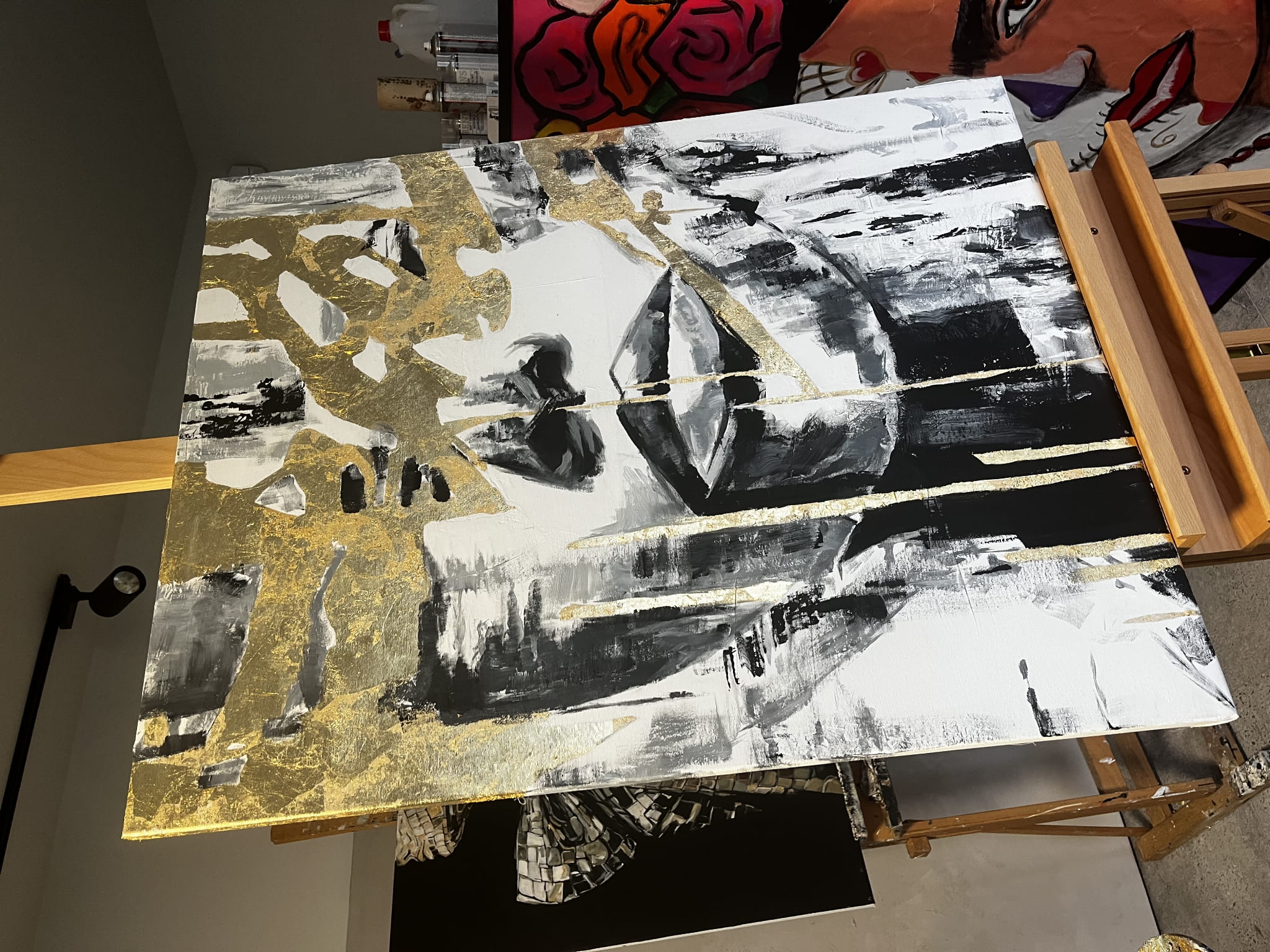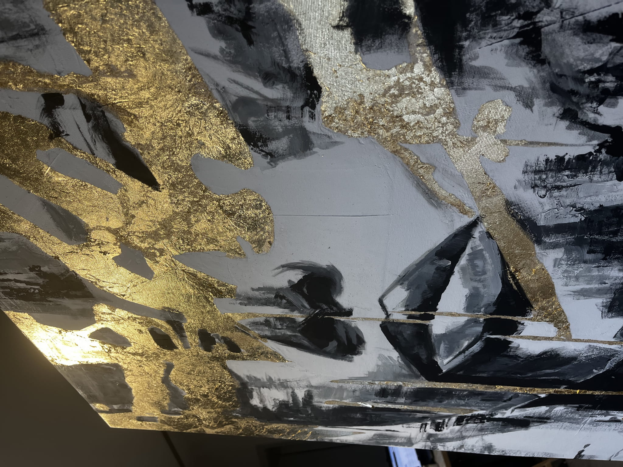 Nowoczesna, ekspresyjna kompozycja przedstawiająca stylizowaną twarz wyłaniającą się z dynamicznych pociągnięć czerni, bieli i szarości, przełamanych błyszczącymi złotymi akcentami. Złote linie i struktury nadają całości elegancki, luksusowy charakter, a kontrast z surową monochromatyczną paletą tworzy efekt głębi i dramatyzmu.