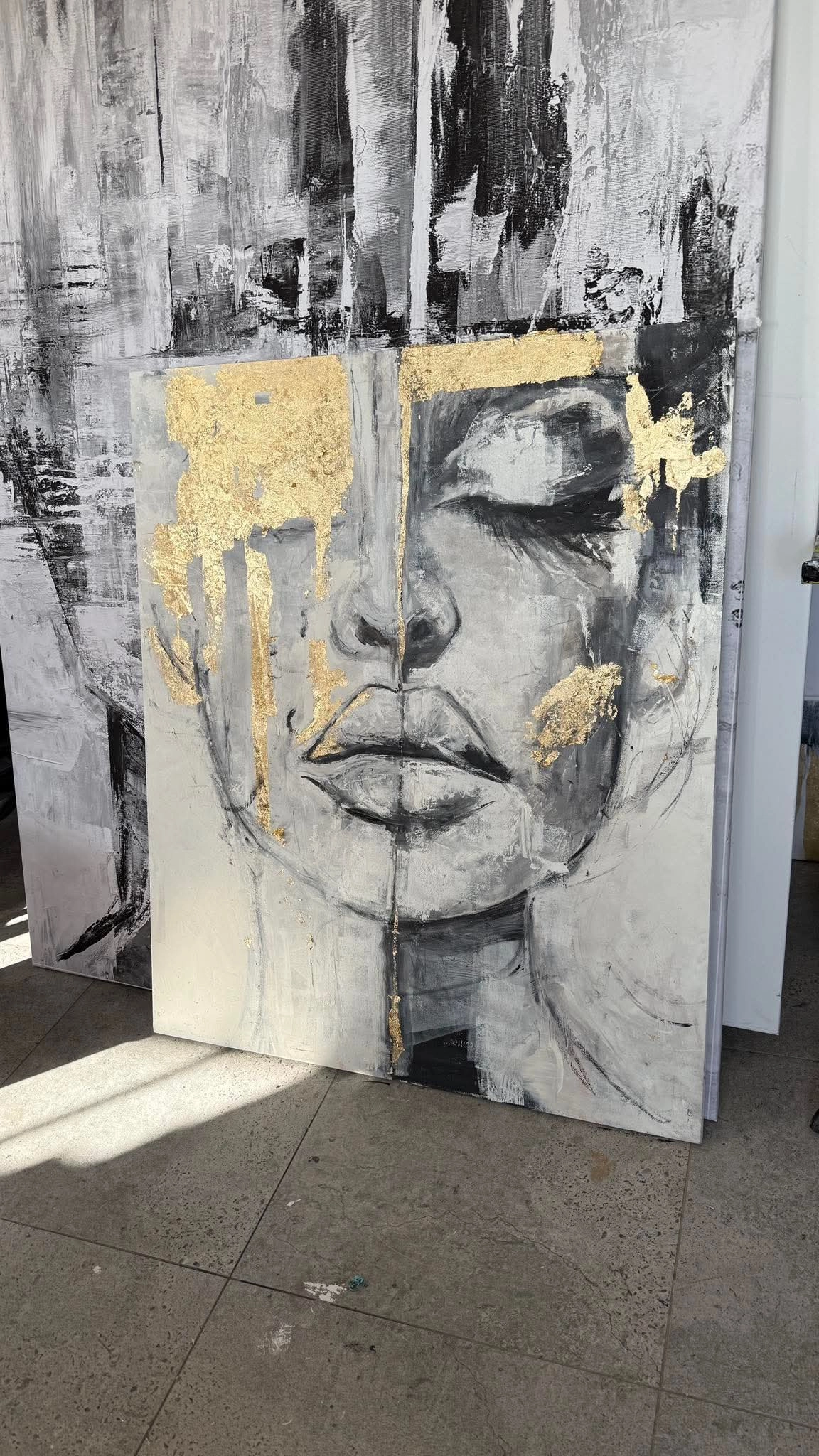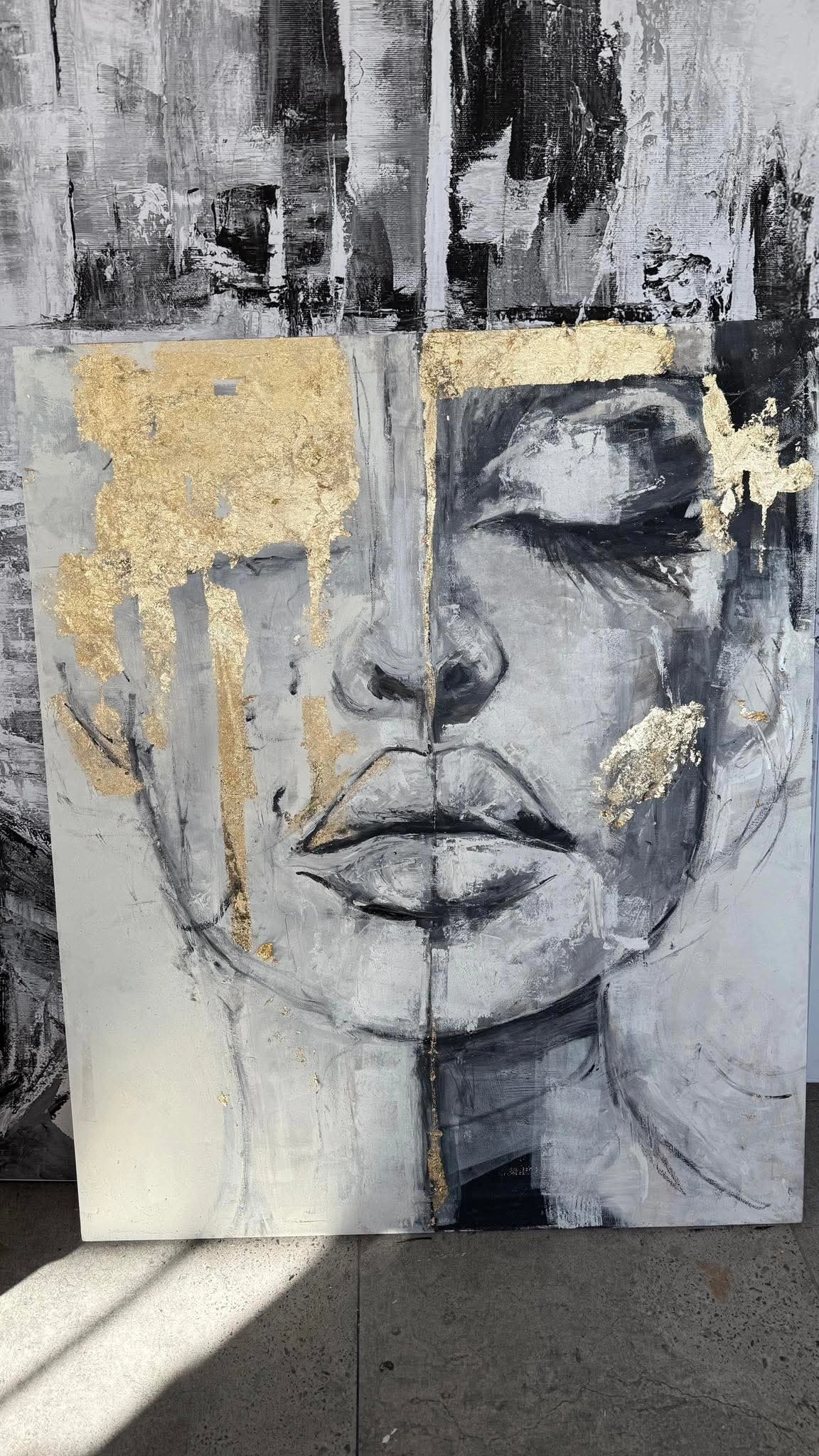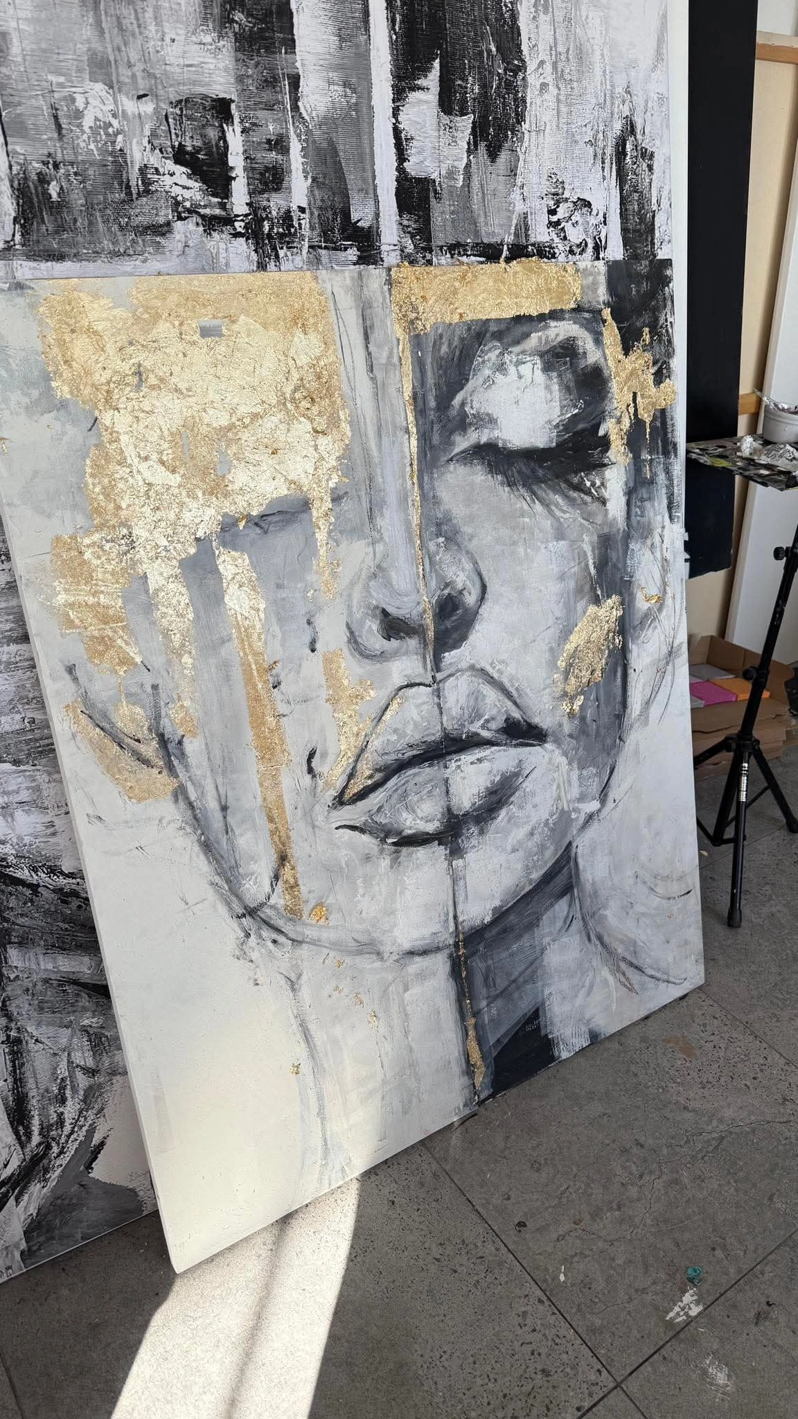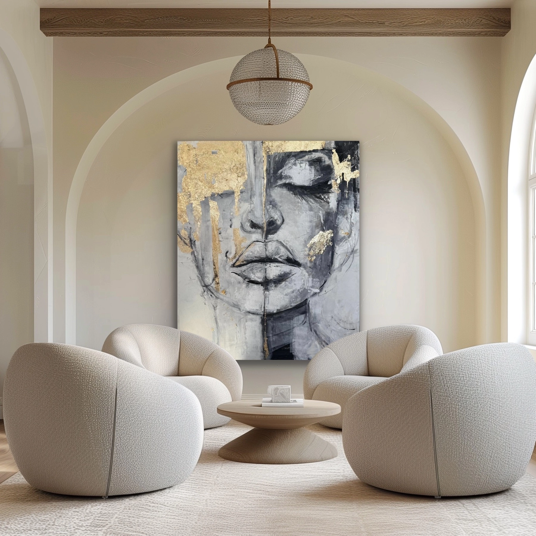 Centralnym motywem jest kobieca twarz – delikatna, lekko rozmyta, jak wspomnienie lub emocja uchwycona w czasie. Strukturalne pociągnięcia, warstwowość farby i surowość formy nadają pracy charakter nowoczesnej sztuki, idealnej do wnętrz minimalistycznych, naturalnych i premium.