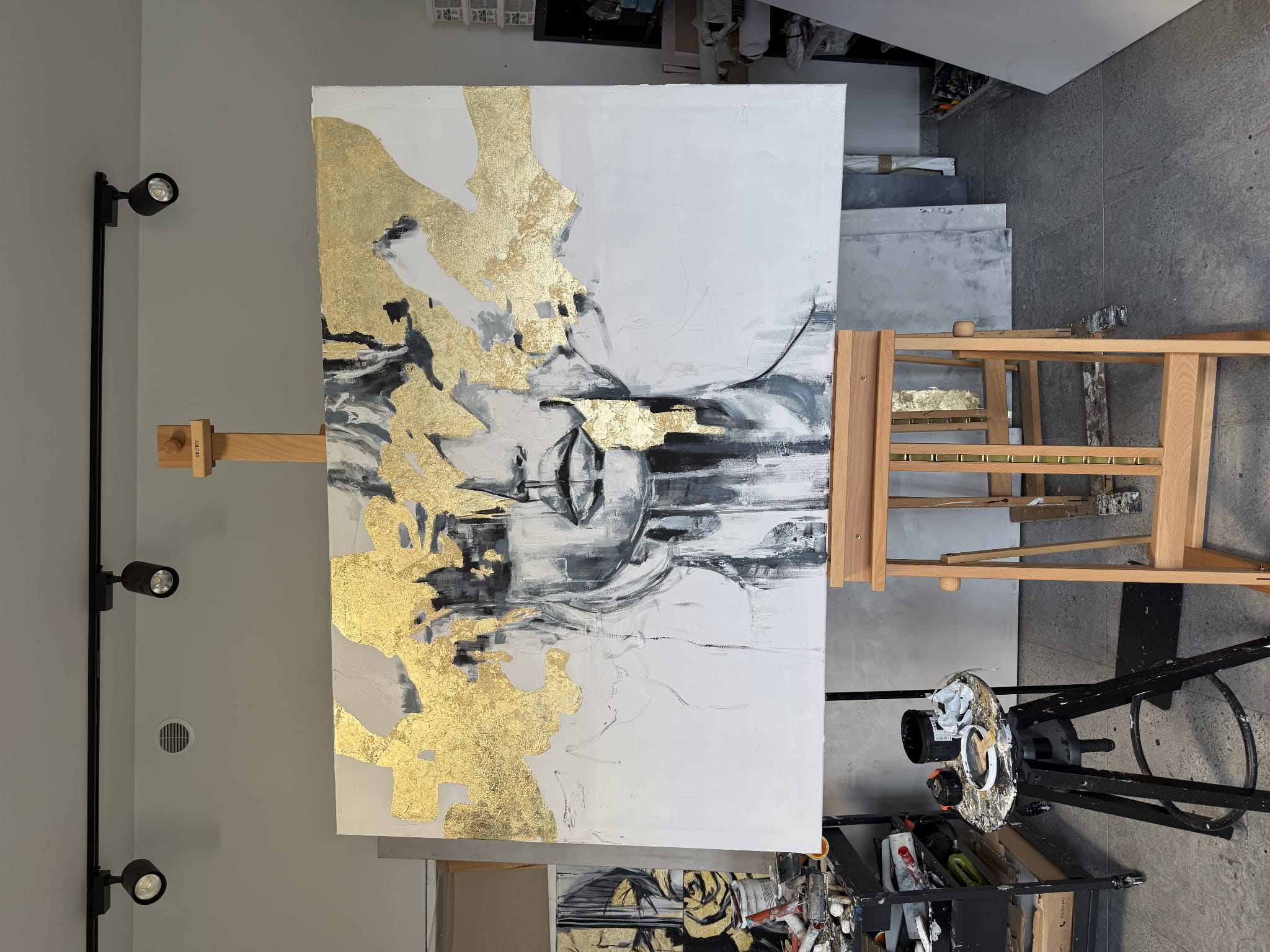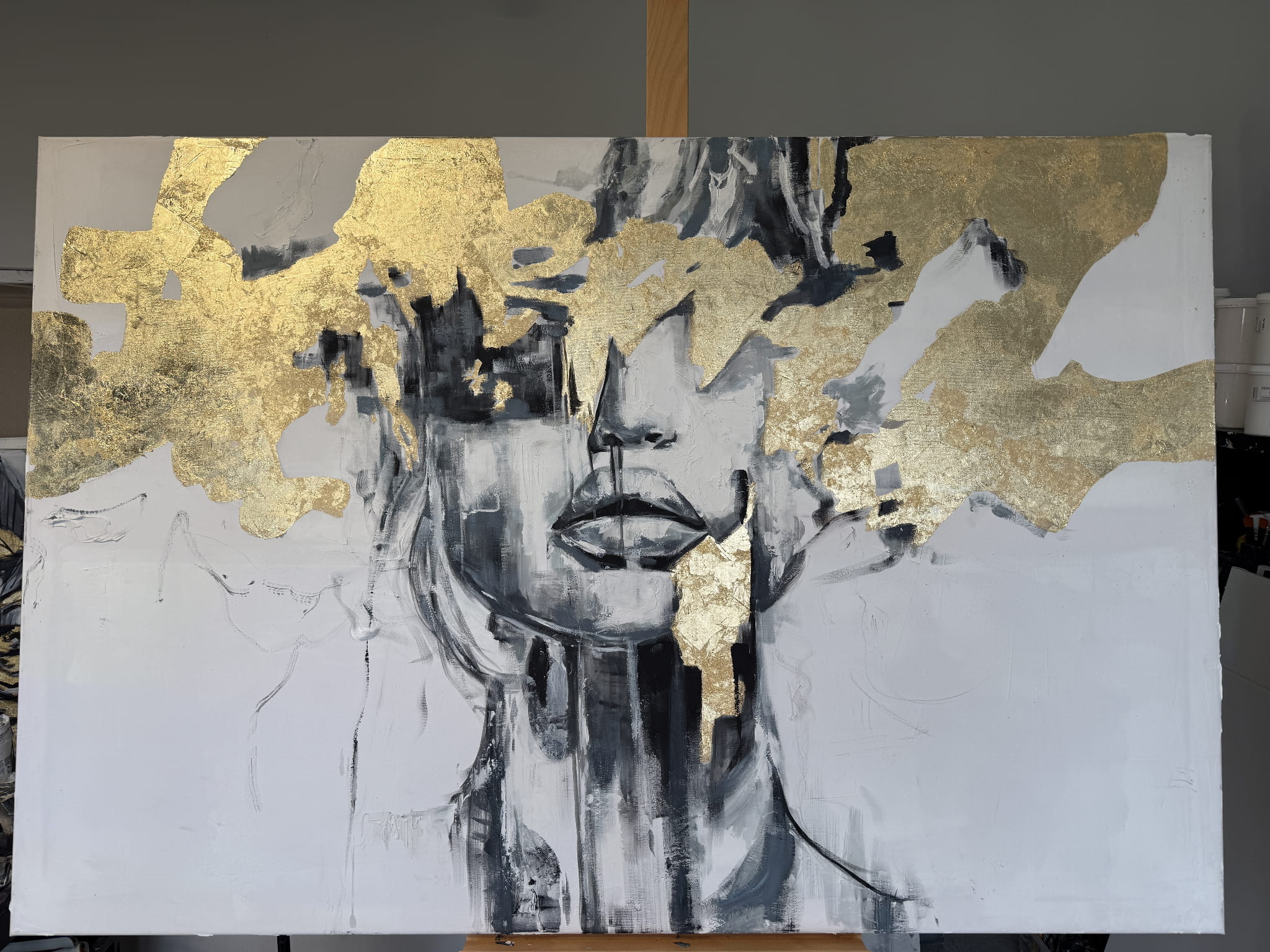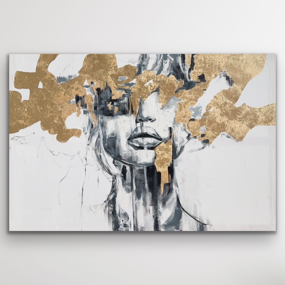 Portret balansujący na granicy abstrakcji i realizmu. Złote płaty przecinają spojrzenie, budując napięcie między delikatnością a siłą. Obraz przyciąga światło i zmienia się w zależności od perspektywy — to statement do wnętrz minimalistycznych i artystycznych.