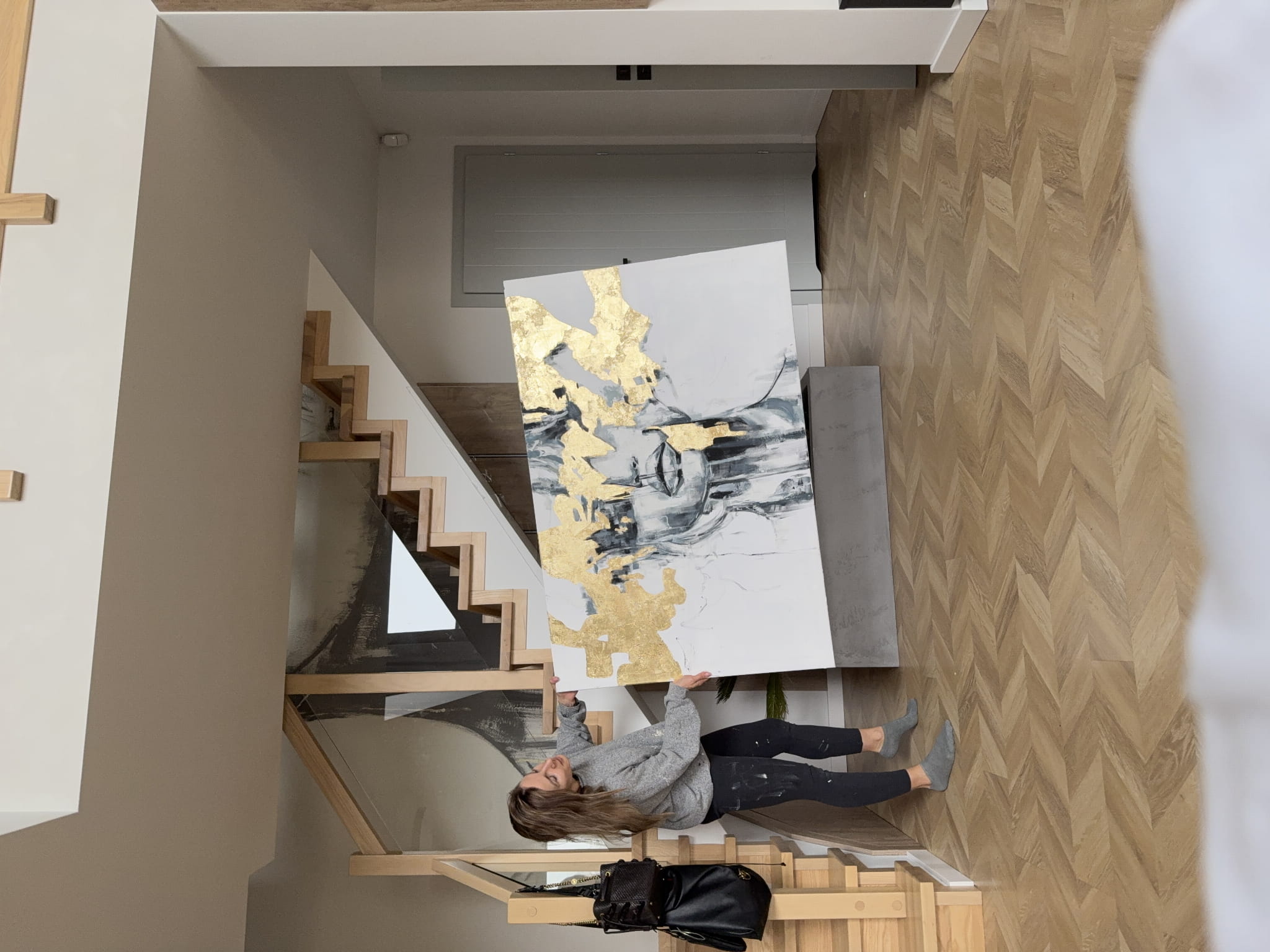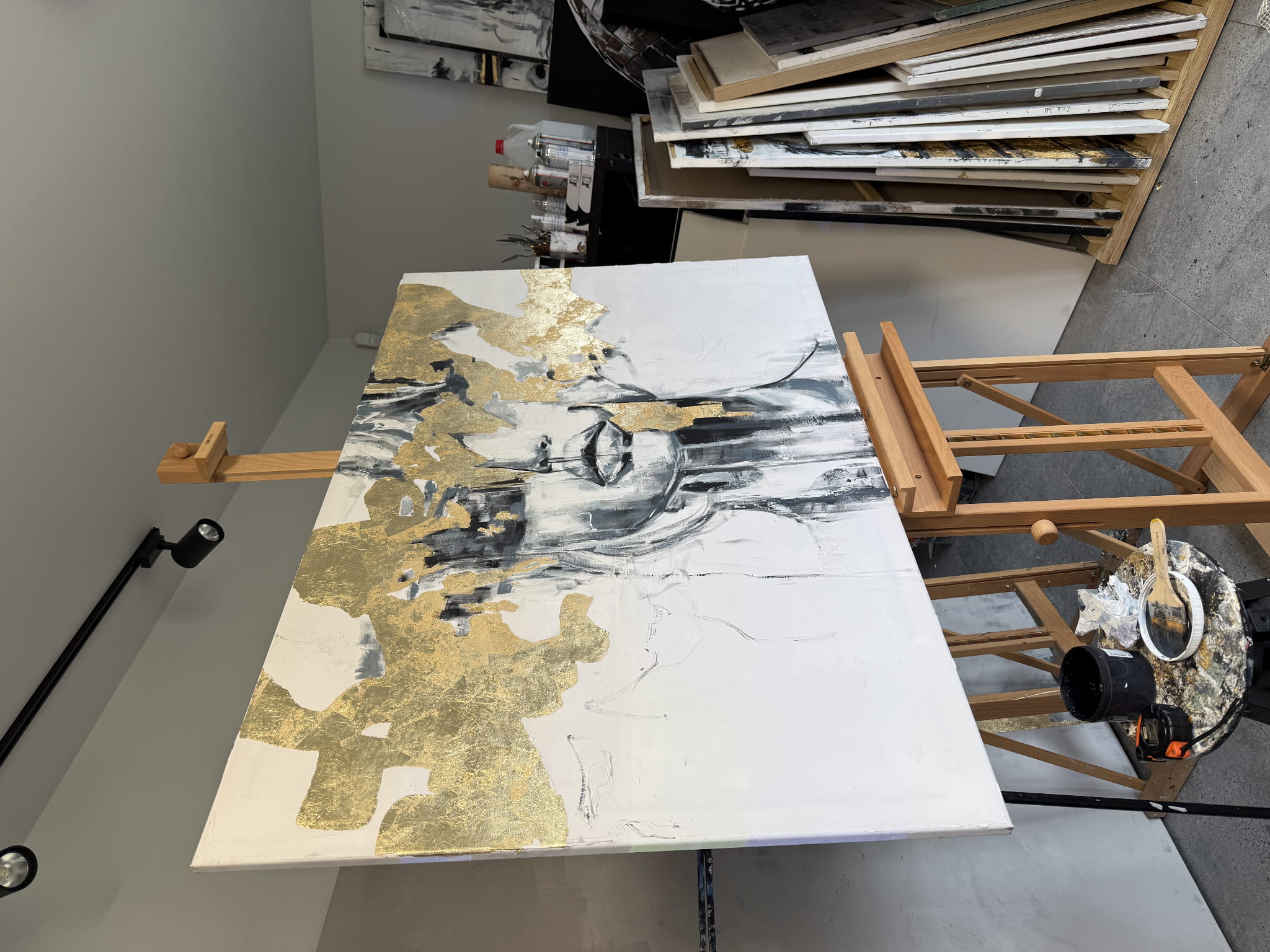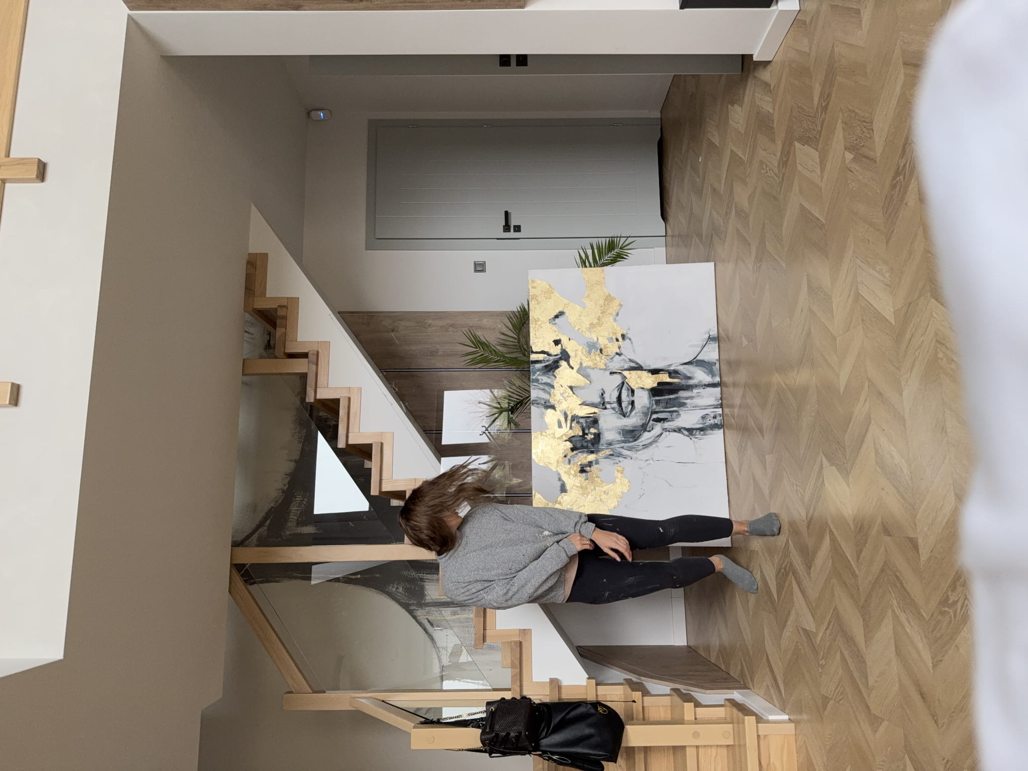 Portret balansujący na granicy abstrakcji i realizmu. Złote płaty przecinają spojrzenie, budując napięcie między delikatnością a siłą. Obraz przyciąga światło i zmienia się w zależności od perspektywy — to statement do wnętrz minimalistycznych i artystycznych.