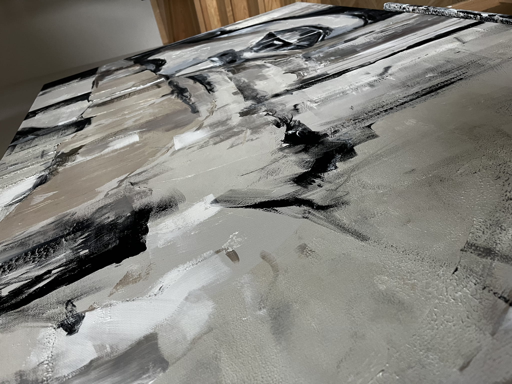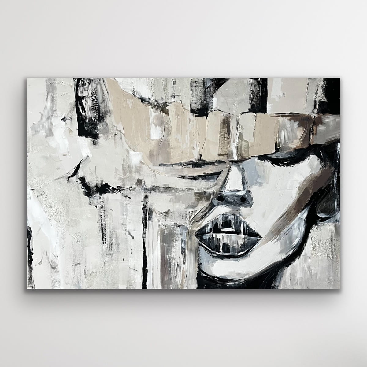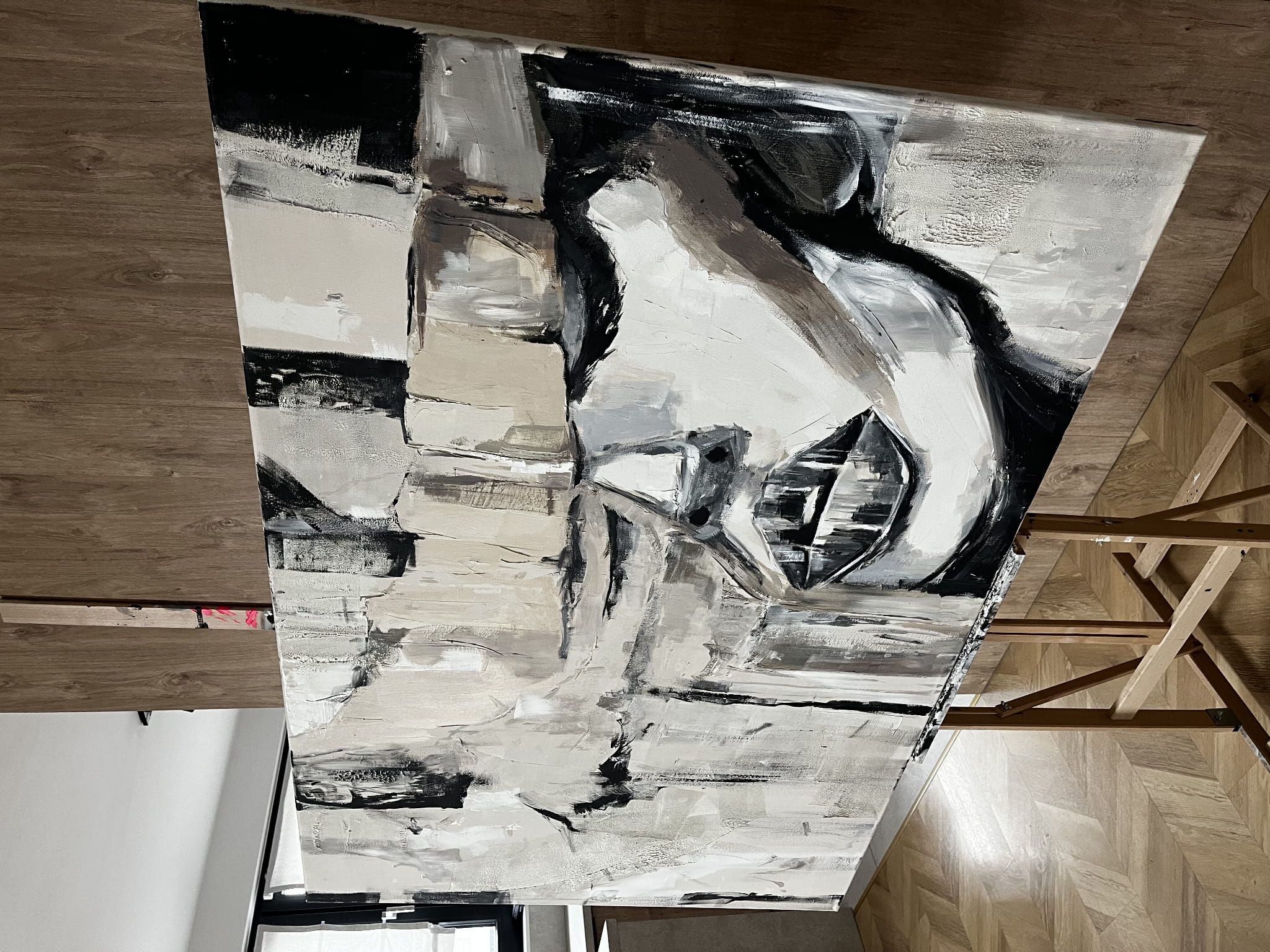 Ekspresyjny fragment twarzy rozbity na abstrakcyjne płaszczyzny, pełen energii i niepokoju. Obraz balansuje pomiędzy figuracją a abstrakcją, budując silny, magnetyczna.