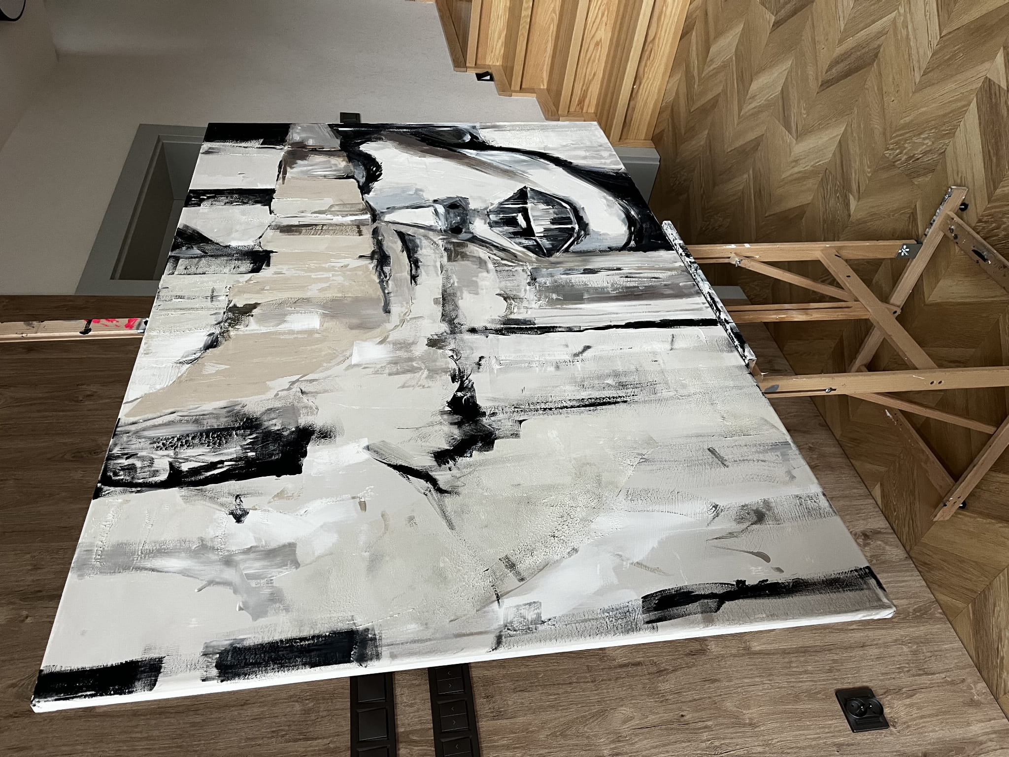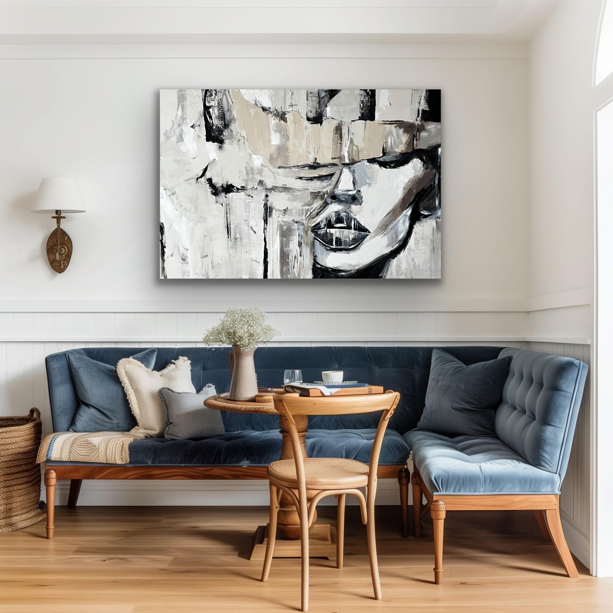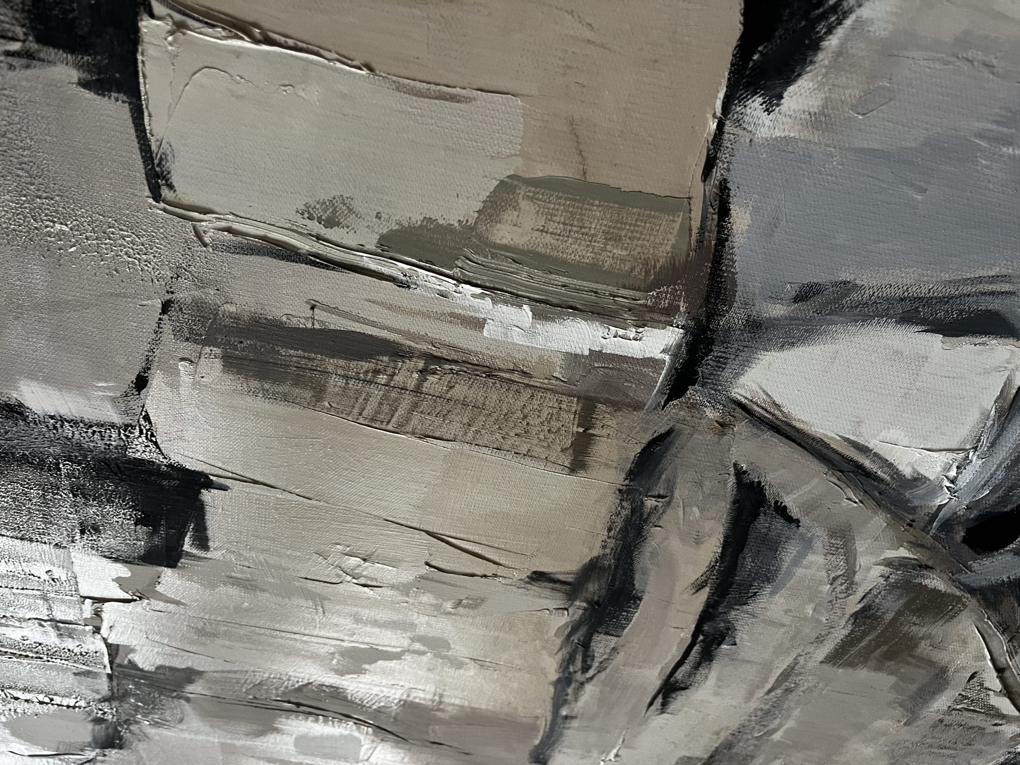 Ekspresyjny fragment twarzy rozbity na abstrakcyjne płaszczyzny, pełen energii i niepokoju. Obraz balansuje pomiędzy figuracją a abstrakcją, budując silny, magnetyczna.